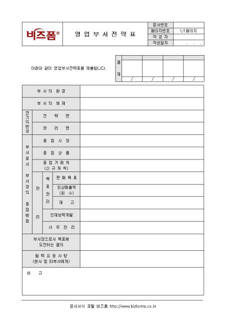 영업부서의 목표 및 전략을 수립할 때 사용하는 영업부서전략표입니다. 부서의 환경, 부서의 체제, 전기의 반성 등의 항목으로 구성되어있으며 부서장이 작성합니다.
