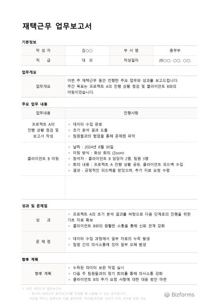 표준 재택근무 업무보고서 서식입니다. 해당 서식을 활용하면 재택근무 중에도 효율적으로 업무를 관리하고, 팀원과의 소통을 강화할 수 있습니다.