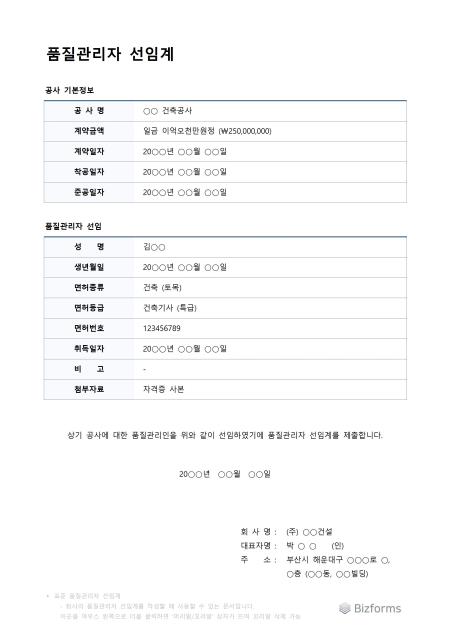 표준 품질관리자 선임계 서식입니다. 표준 품질관리자 선임계 서식은 품질관리자의 선임을 공식적으로 기록하고 승인하기 위한 문서입니다. 이 서식은 품질 관리 시스템의 효과적인 운영을 보장하고, 품질 관련 업무를 담당할 적절한 인력을 지정하기 위해 필요합니다.