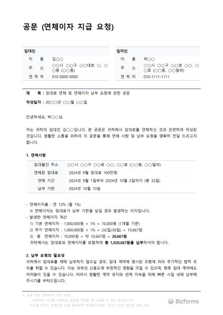 공문 (연체이자 지급 요청) 서식입니다. 연체이자 지급 요청 공문은 채무자가 약정된 기한 내에 지급하지 않은 금액에 대해 연체이자를 요구하기 위해 작성하는 공식 문서입니다. 이 공문은 법적 근거를 바탕으로 하여 채무자의 빠른 대응을 유도하는 역할을 합니다. 명확하고 간결한 문구를 사용하여 상대방이 이해하기 쉽게 작성하는 것이 중요합니다. 또한, 필요한 모든 정보를 포함하여 법적 효력을 갖출 수 있도록 해야 합니다.