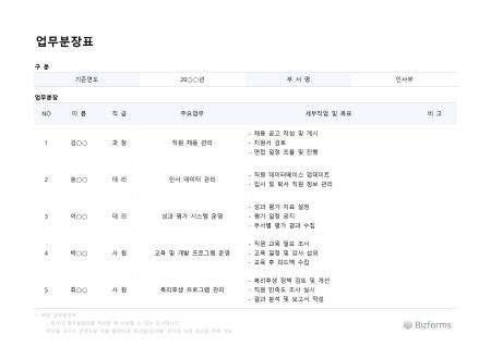 표준 업무분장표 서식입니다. 업무분장표는 조직 내 각 구성원의 업무와 책임을 명확히 정리한 문서로, 효율적인 업무 수행에 필수적입니다. 이 표는 팀원 간의 역할 분담을 명확히 하고, 업무의 세부사항과 우선순위를 설정하여 중복 작업을 방지합니다. 결과적으로, 조직의 생산성을 높이고 체계적인 운영을 지원하는 중요한 도구입니다.