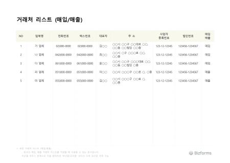 표준 거래처 리스트 (매입매출) 서식입니다. 거래처 리스트(매입매출별) 서식은 기업이 거래하는 고객 및 공급업체에 대한 정보를 체계적으로 정리한 문서입니다. 이 서식은 매입과 매출을 구분하여 각 거래처의 거래 내역을 명확히 파악할 수 있도록 돕습니다.