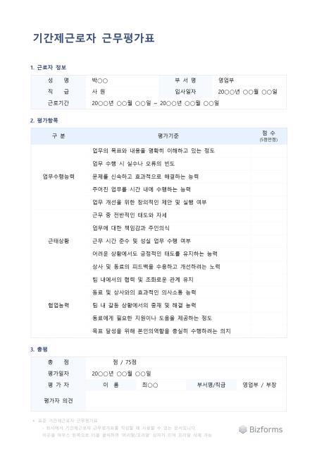 표준 기간제근로자 근무평가표 서식입니다. 기간제 근로자 근무평가표 서식은 근로자의 업무 수행 능력, 태도, 협업 능력 등을 체계적으로 평가하기 위한 문서입니다. 이 서식은 근로자의 성과를 정량적으로 측정하고, 향후 발전 방향을 제시하는 데 중요한 역할을 합니다.