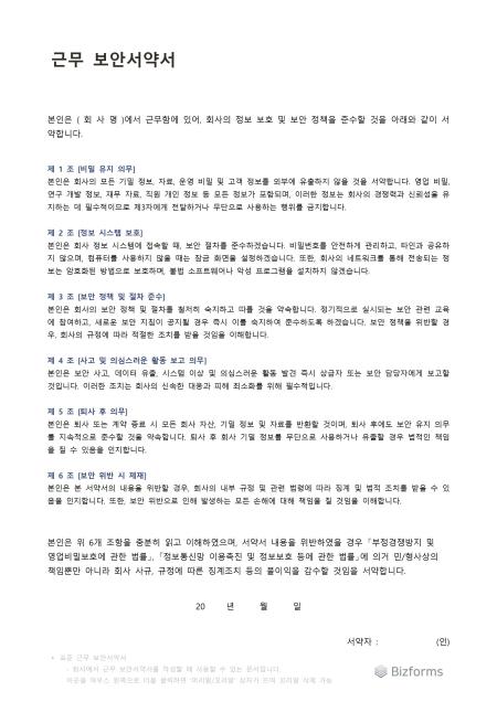 표준 근무 보안서약서 서식입니다. 근무 보안서약서는 직원이 회사의 보안 정책과 절차를 준수하겠다는 의사를 공식적으로 표현하는 문서입니다. 이 서약서는 정보 유출 방지, 기밀 유지 및 회사 자산 보호의 중요성을 강조하며, 직원의 책임을 명확히 합니다. 서약서를 작성함으로써 직원은 보안 관련 법규와 규정을 이해하고 준수할 것을 약속하게 됩니다.