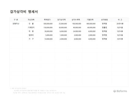 표준 감가상각비 명세서 서식입니다. 감가상각비 명세서 서식은 기업이 자산의 감가상각을 기록하고 보고하는 데 사용되는 문서입니다. 감가상각은 자산의 가치를 시간에 따라 감소시키는 회계 처리로, 기업의 재무제표에 중요한 영향을 미칩니다.