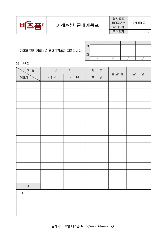 9,000원/월거래처별로 판매계획을 수립하고자 할 때 사용하는 거래처별판매계획표입니다. 구분, 거래처, 실적, 계획, 증감률 등의 항목으로 구성되어있으며 해당부서장에게 작성/보고합니다.