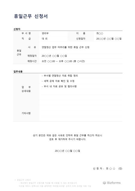 표준 휴일근무 신청서 서식입니다. 휴일근무 신청서 서식은 직원이 휴일에 근무를 요청할 때 사용하는 공식 문서로, 신청자 정보, 근무 일자 및 시간, 근무 사유 등을 포함합니다. 이 서식은 상급자의 승인도 필요하며, 회사의 정책에 따라 다를 수 있습니다. 휴일근무 신청서는 직원의 근무 조건을 명확히 하고 인사 관리에 도움을 줍니다.