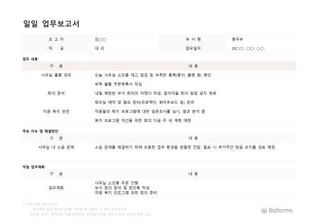표준 일일 업무보고서(가로형) 서식입니다. 일일 업무보고는 하루 동안 수행한 업무와 결과를 정리하여 보고하는 문서입니다. 주요 내용에는 업무 내용, 진행 상황, 문제 및 이슈, 내일 계획이 포함됩니다. 이를 통해 팀 내 소통을 원활하게 하고 업무의 투명성을 높일 수 있습니다. 간결하고 명확한 보고가 중요합니다.