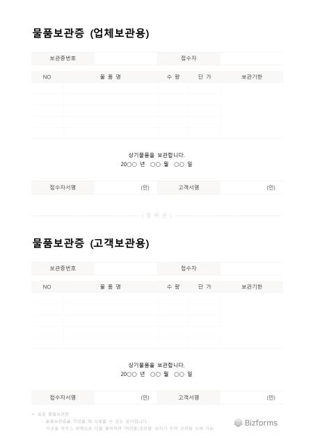 물품 보관증 표준 서식입니다. 이 서식은 물품을 보관하는 업체가 고객에게 발급하는 문서로, 보관된 물품의 종류, 수량, 단가, 보관 기한 등을 명시합니다. 한 페이지에는 업체 보관용과 고객 보관용이 포함되어 있으며, 작성 후 절취하여 각각 1부씩 나누어 갖습니다.