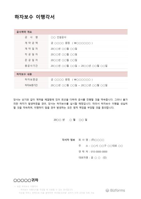 공사가 완료된 후 불가피한 하자가 발생했을 경우, 해당 시공업체가 하자보수 공사를 책임지고 실시할 것을 약속하는 법적 서면 문서입니다. 건축, 토목, 설비 등 모든 건설공사에서 활용되며, 발주자와 시공업체 간의 신뢰 관계를 구축하는 중요한 계약서류입니다.