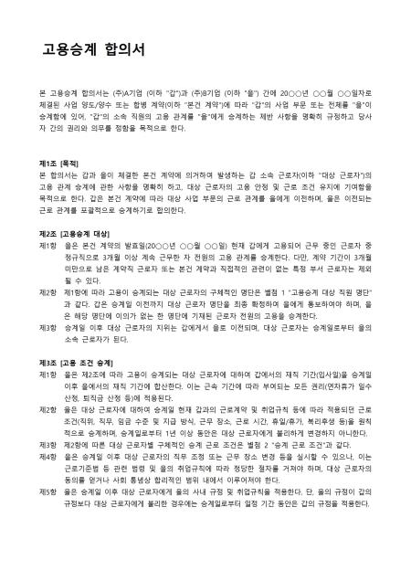 표준 고용승계 합의서 서식입니다. 고용승계 합의서는 사업의 양도, 합병 등으로 인해 기존 사업장의 근로관계가 새로운 사업주에게 그대로 이어짐을 당사자 간에 합의하는 문서로 해당 서식에는 승계되는 근로자의 명단, 근로 조건(급여, 직위, 근속 기간 등), 그리고 승계 효력 발생일 등 중요한 내용이 포함됩니다.