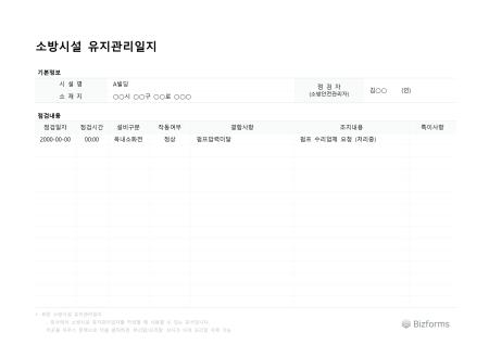 표준 소방시설 유지관리일지 서식입니다. 소방안전관리 대상물의 소방시설에 대한 자체점검 및 유지관리 활동을 기록하는 서식입니다.