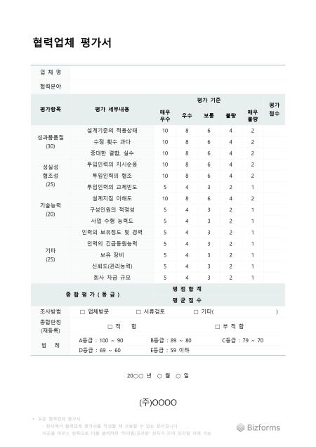표준 협력업체 평가서 서식입니다. 협력업체 평가서 서식은 협력업체 관리를 위해 거래 중이거나 거래 예정인 업체의 기술, 품질, 납기, 재무 상태 등을 종합적으로 평가하는 데 사용되는 문서입니다. 이 서식은 평가 결과에 따라 협력업체의 등록 여부를 결정하거나 등급을 분류하고 관리하는 데 활용되며, 안정적이고 효율적인 공급망 운영을 위한 기초 자료가 됩니다.