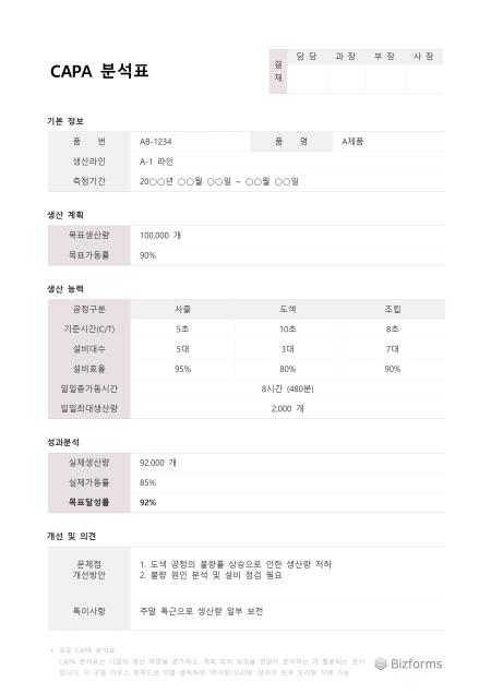 표준 CAPA 분석표 서식입니다. CAPA 분석표는 기업의 생산 역량을 평가하고, 계획 대비 실적을 면밀히 분석하는 데 활용되는 문서입니다. 본 서식을 통해 잠재적 병목 현상 및 개선 필요 영역을 식별하여, 효율적인 생산 관리 및 생산성 향상에 기여할 수 있습니다.