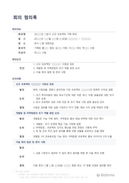 표준 회의 협의록 서식입니다. 회의 협의록 서식은 회의에서 논의된 주요 안건, 참석자들의 의견 교환 내용, 그리고 최종적으로 합의된 결정 사항들을 체계적으로 기록하기 위한 공식 문서입니다. 이는 회의 결과의 명확성을 보장하고, 참여자 간의 오해를 방지하며, 후속 조치의 기반을 마련하는 중요한 역할을 수행합니다.