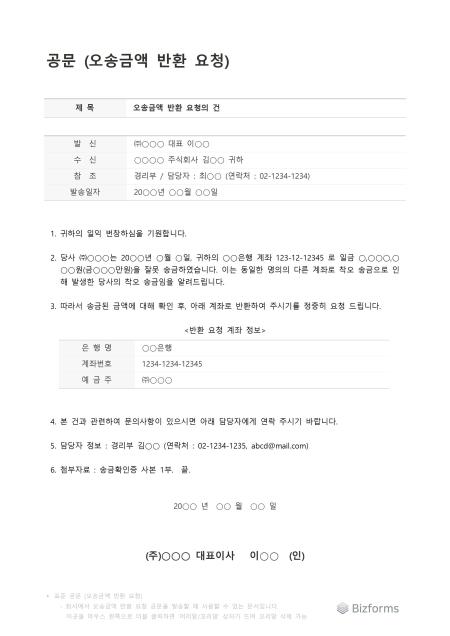 표준 공문 (오송금액 반환 요청) 서식입니다. 표준 공문(오송금액 반환 요청) 서식은 착오로 인해 잘못 송금된 금액의 반환을 상대방에게 공식적으로 요청할 때 사용되며, 이 문서는 오송금 발생 사실과 정확한 금액, 그리고 반환이 필요한 계좌 정보를 명확히 전달하여 신속한 문제 해결을 돕습니다.