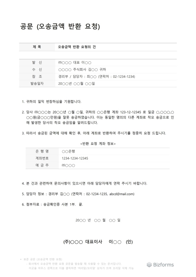 9,000원/월표준 공문 (오송금액 반환 요청) 서식입니다. 표준 공문(오송금액 반환 요청) 서식은 착오로 인해 잘못 송금된 금액의 반환을 상대방에게 공식적으로 요청할 때 사용되며, 이 문서는 오송금 발생 사실과 정확한 금액, 그리고 반환이 필요한 계좌 정보를 명확히 전달하여 신속한 문제 해결을 돕습니다.