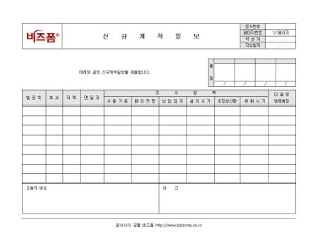 신규와 관련된 사항을 기록/관리하는 신규개척일보입니다. 방문처, 부서, 직책, 면담자, 조사항목 등의 항목으로 구성되어있으며 담당자가 작성합니다.