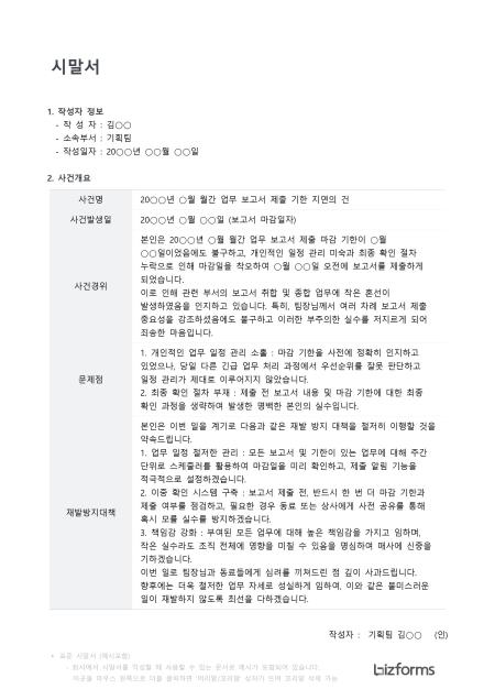 표준 시말서 (예시포함) 서식입니다. 시말서는 직원이 자신의 잘못이나 실수로 인해 발생한 문제의 경위, 그에 대한 자신의 책임 인정, 그리고 재발 방지를 위한 다짐 등을 상세히 작성하여 제출하는 문서입니다. 예시가 포함되어 있어 작성자는 복잡한 내용도 쉽게 이해하고 작성할 수 있으며, 조직 내에서 잘못된 상황을 바로잡고 직원 개인의 성장을 유도하는 중요한 도구로 활용됩니다.