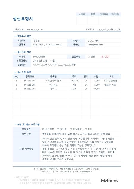 표준 생산요청서 서식입니다. 생산요청서는 특정 제품이나 부품의 생산을 지시하거나 의뢰할 때 사용되는 문서입니다. 이 서식은 생산해야 할 품목의 품명, 규격, 수량, 납기일, 생산 목적 등 핵심적인 정보를 명확히 기재하여, 생산 부서나 외부 협력업체에 정확한 지시를 전달하는 데 중요한 역할을 합니다.