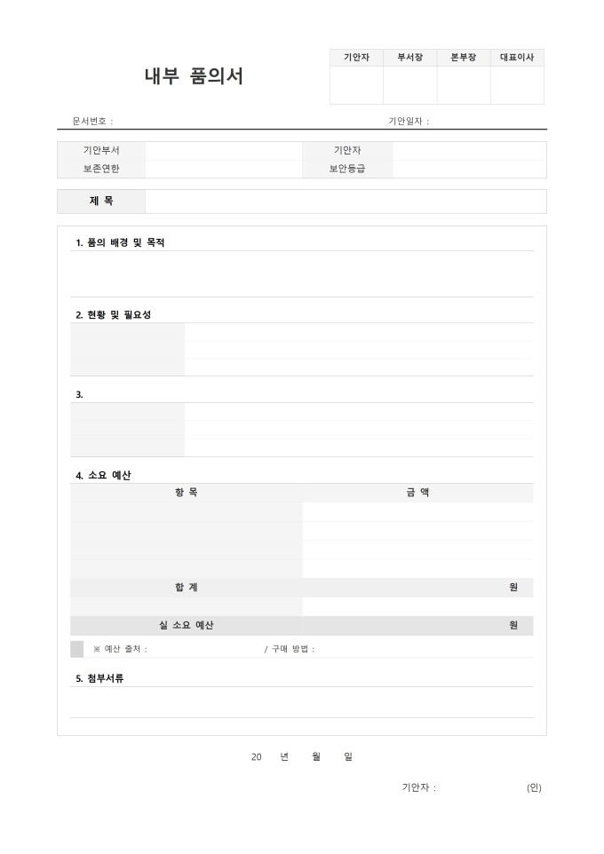 9,000원/월표준 내부 품의서 서식입니다. 내부 품의서는 조직 내에서 특정 사안에 대한 승인을 받기 위해 상급자 또는 결재권자에게 제출하는 공식적인 의사결정 문서입니다. 주로 예산 집행, 물품 구매, 인력 채용, 계약 체결, 규정 개정, 업무 추진 등 회사의 중요한 의사결정이 필요한 사항에 대해 작성하며, 품의 배경과 목적, 현황 분석, 세부 추진 계획, 소요 예산, 기대 효과 등을 논리적이고 체계적으로 기술하여 결재권자가 합리적인 판단을 내릴 수 있도록 돕습니다.