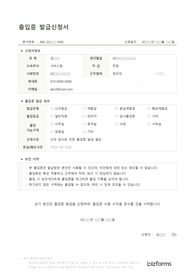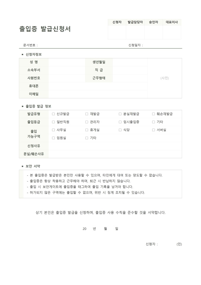 9,000원/월표준 출입증 발급신청서 서식입니다. 출입증 발급신청서는 특정 시설이나 기관에 대한 접근 권한을 얻기 위해 제출하는 필수 서식으로 여기에는 신청자의 소속, 직급, 성명 등 기본 정보와 함께 출입 유형, 등급 등이 명확히 기재되어야 합니다. 신속하고 안전한 출입증 발급을 위해 정확한 개인 정보와 필요한 신분증 등 증빙 서류를 첨부하는 것이 중요합니다.
