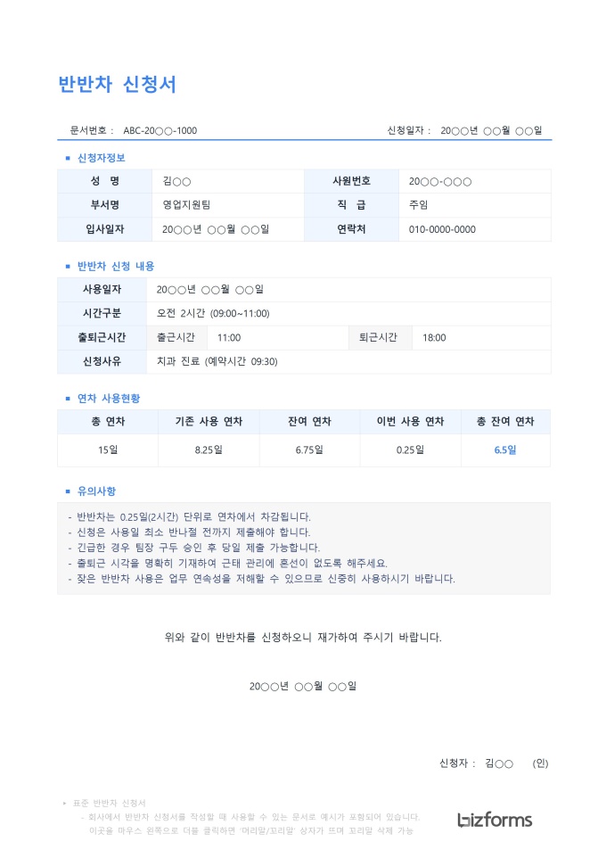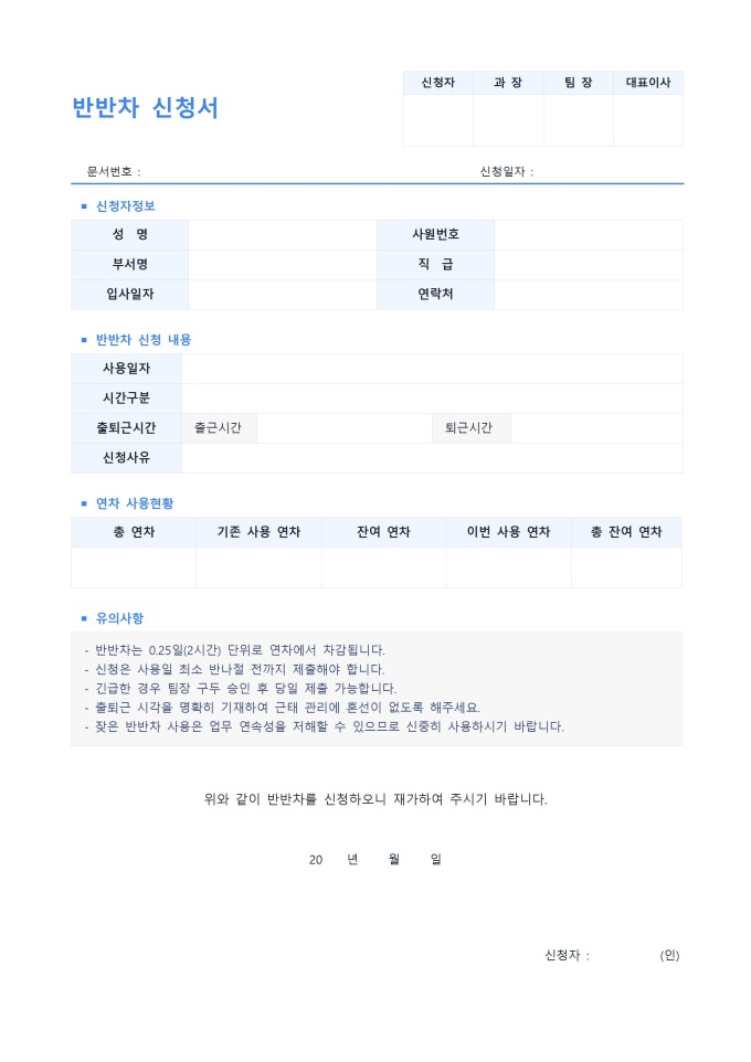 9,000원/월표준 반반차 신청서 서식입니다. 반반차 신청서는 직원이 하루의 1/4에 해당하는 약 2시간 정도의 짧은 시간을 연차로 사용하고자 할 때 제출하는 문서입니다. 최근 유연 근무 문화가 확산되면서 병원 진료, 관공서 업무, 자녀 학교 행사 등 짧은 개인 용무를 처리하기 위해 반반차 제도를 도입하는 기업이 증가하고 있습니다. 이 서식은 변경된 출퇴근 시각을 명확히 기재하여 근태 관리의 정확성을 높입니다.