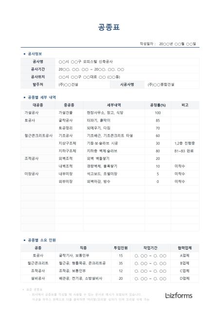 표준 공종표 서식입니다. 공종표는 건설 현장에서 공사를 공종별로 분류하여 작업 내용, 공정 진행률, 투입 인력, 작업 기간 등을 체계적으로 관리하기 위한 필수 문서입니다.