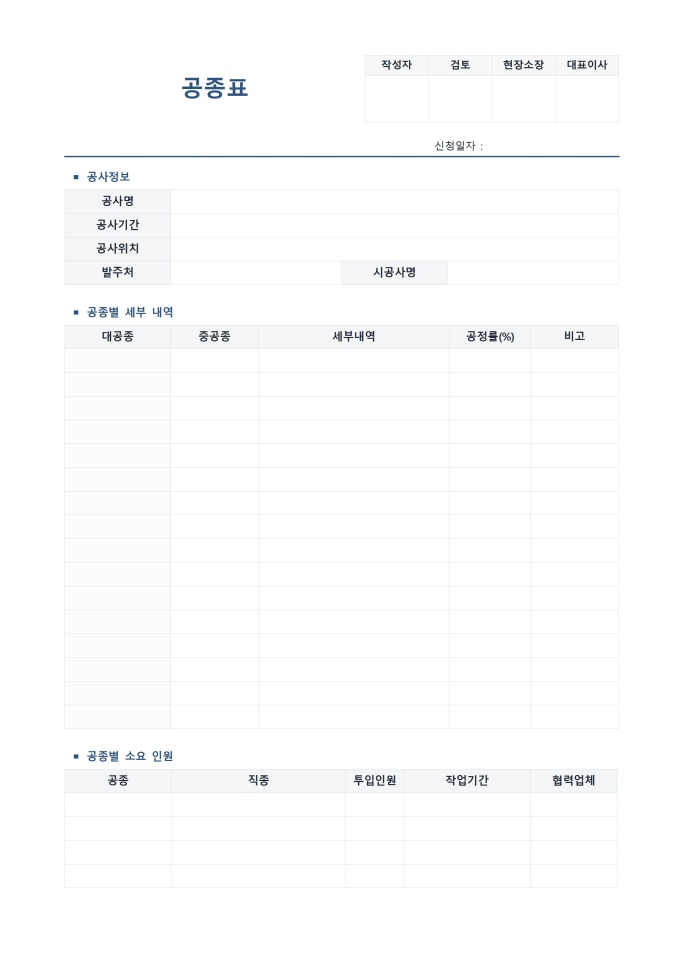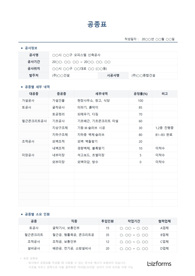 9,000원/월표준 공종표 서식입니다. 공종표는 건설 현장에서 공사를 공종별로 분류하여 작업 내용, 공정 진행률, 투입 인력, 작업 기간 등을 체계적으로 관리하기 위한 필수 문서입니다.
