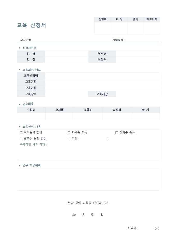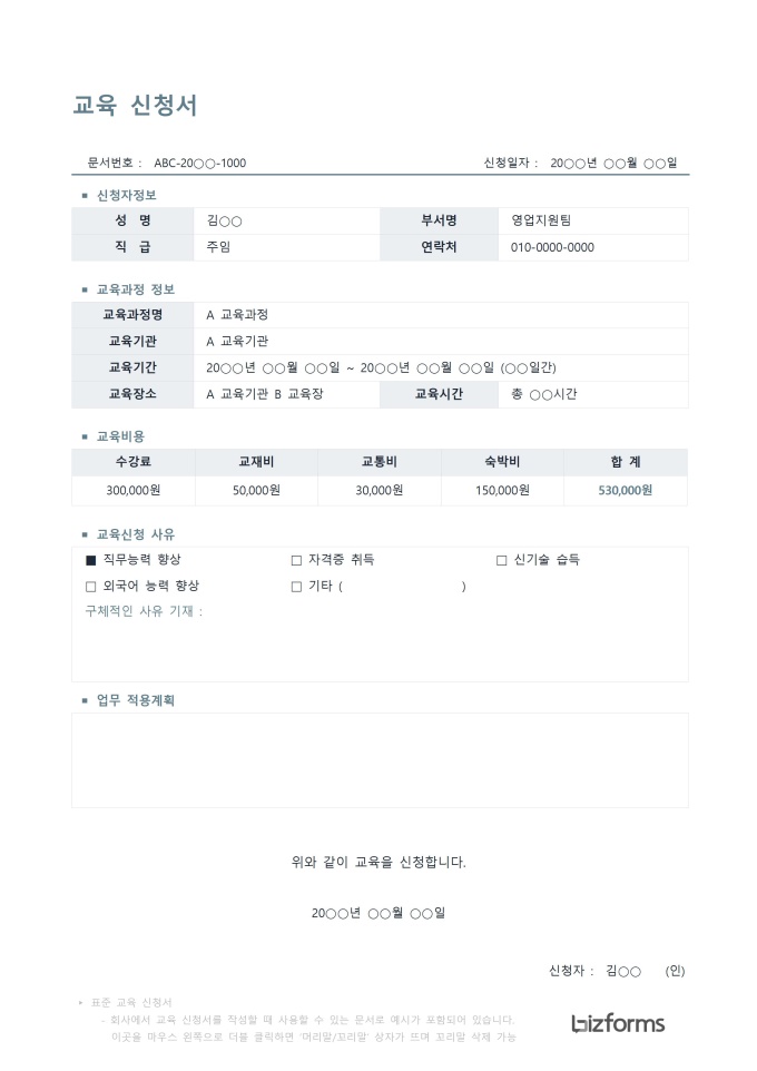 9,000원/월표준 교육신청서 서식입니다. 교육신청서는 개인이 특정 교육 과정, 프로그램 또는 세미나에 참여하고자 할 때 자신의 정보를 제공하고 참여 의사를 밝히는 서식입니다. 회사 내부 교육, 외부 교육 등 효과적인 참가자 관리와 프로그램 운영을 위해 필수적으로 사용되는 서식입니다.