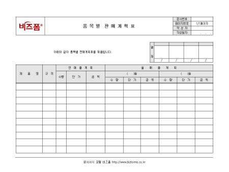 품목별로 판매계획을 수립할 때 사용하는 품목별판매계획표입니다. 제품명, 규격, 연매출계획, 월매출계획 등의 항목으로 구성되어있으며 해당부서장에게 보고합니다.
