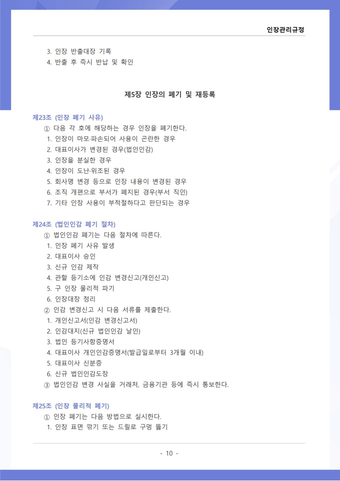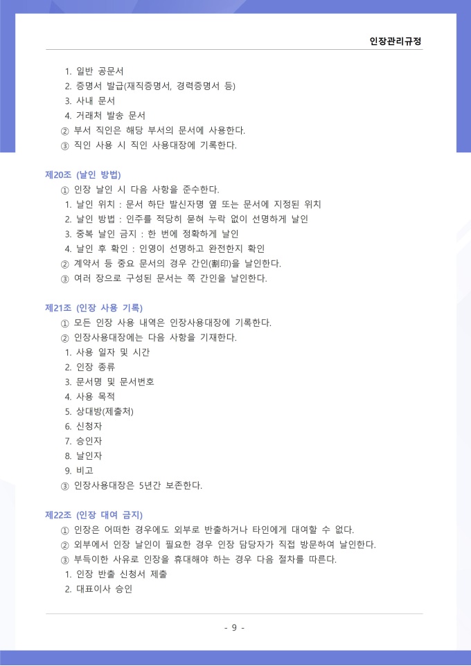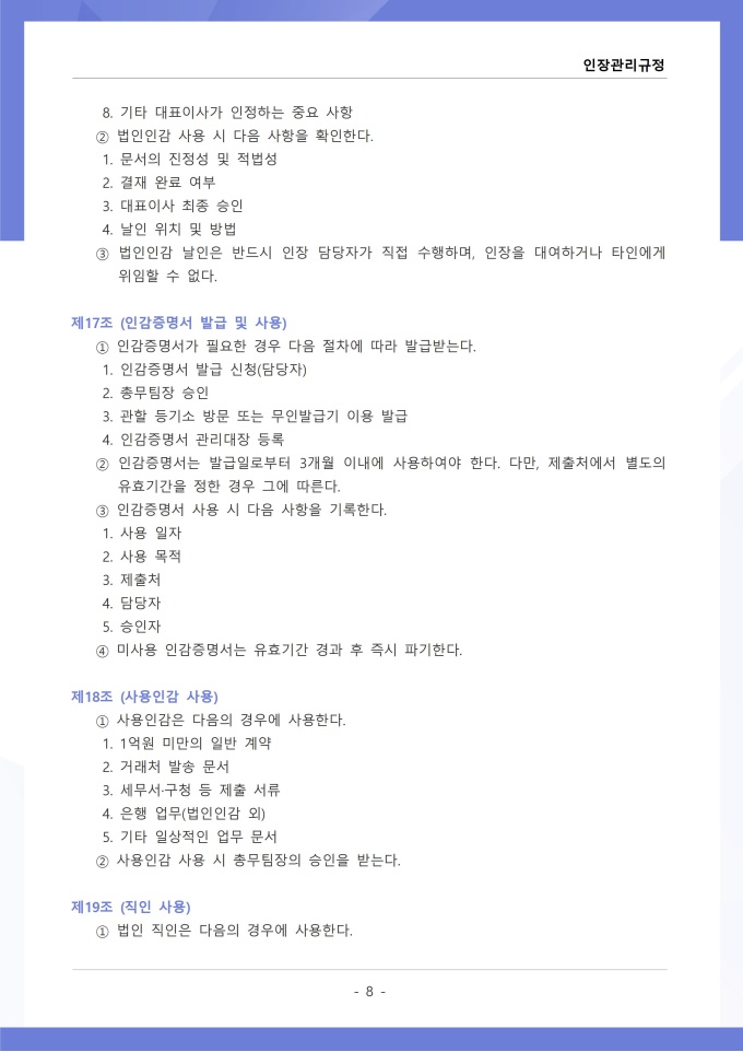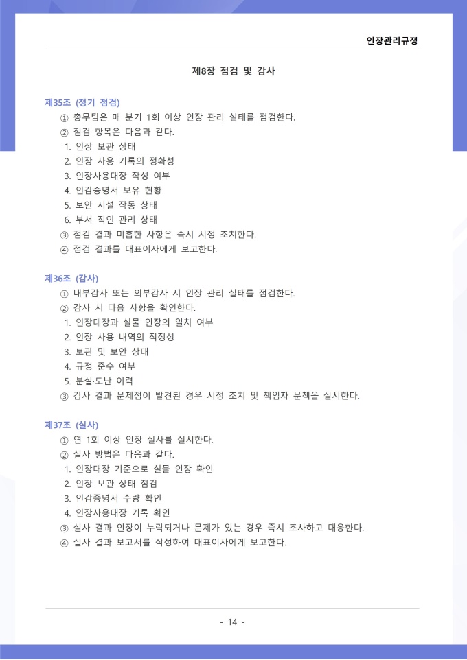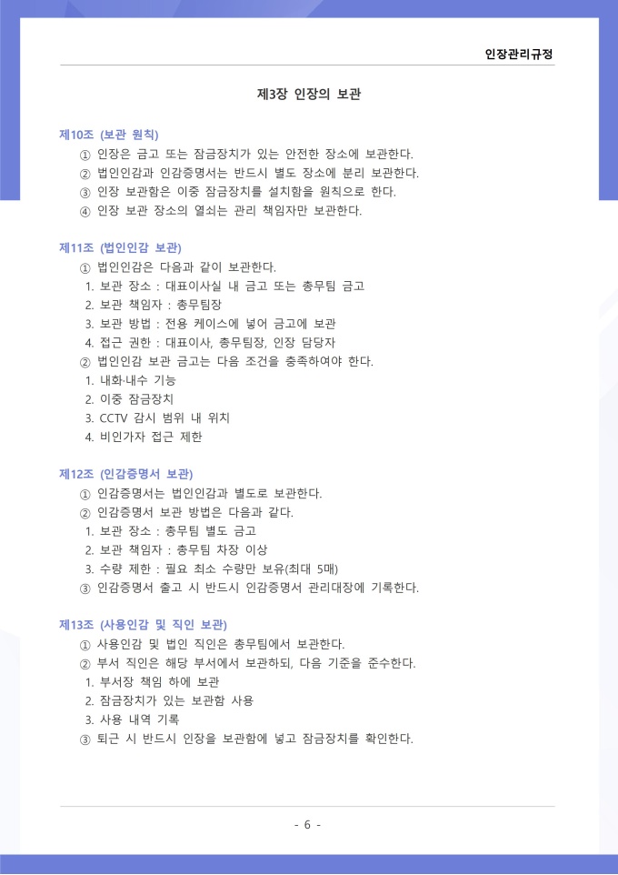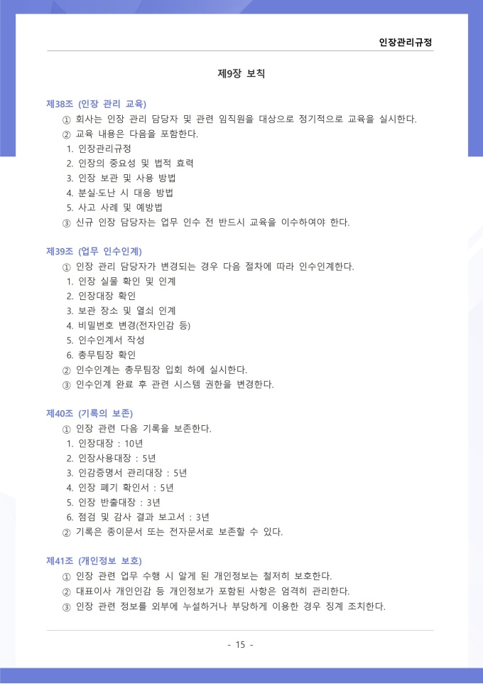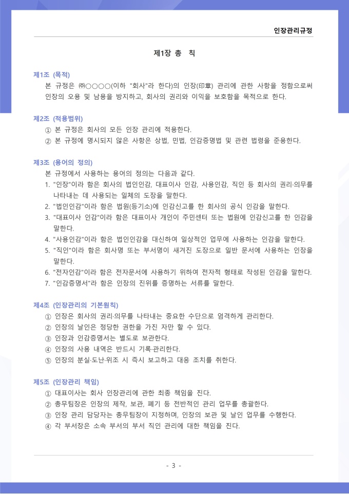 9,000원/월인장관리 규정 서식입니다. 인장관리 규정은 조직 내에서 사용되는 각종 인장의 제작, 보관, 사용 및 폐기에 관한 전반적인 사항을 규정하는 문서입니다. 이 규정에는 법인인감, 사용인감, 업무인감 등 인장의 종류별 관리 책임자와 사용 절차가 명시되어 있습니다. [회사 규정 패키지]는 취업규칙, 인사규정, 복무규정, 상벌규정, 경조사규정, 여비규정 등 조직 운영에 필수적인 각종 사규와 내규를 체계적으로 정립하는 데 필요한 다양한 서식들을 패키지로 제공합니다. 해당 패키지를 통해 회사는 투명하고 일관된 인사 및 조직 관리 기준을 마련할 수 있으며, 구성원들은 명확한 규정에 따라 권리를 보호받고 의무를 준수할 수 있습니다.