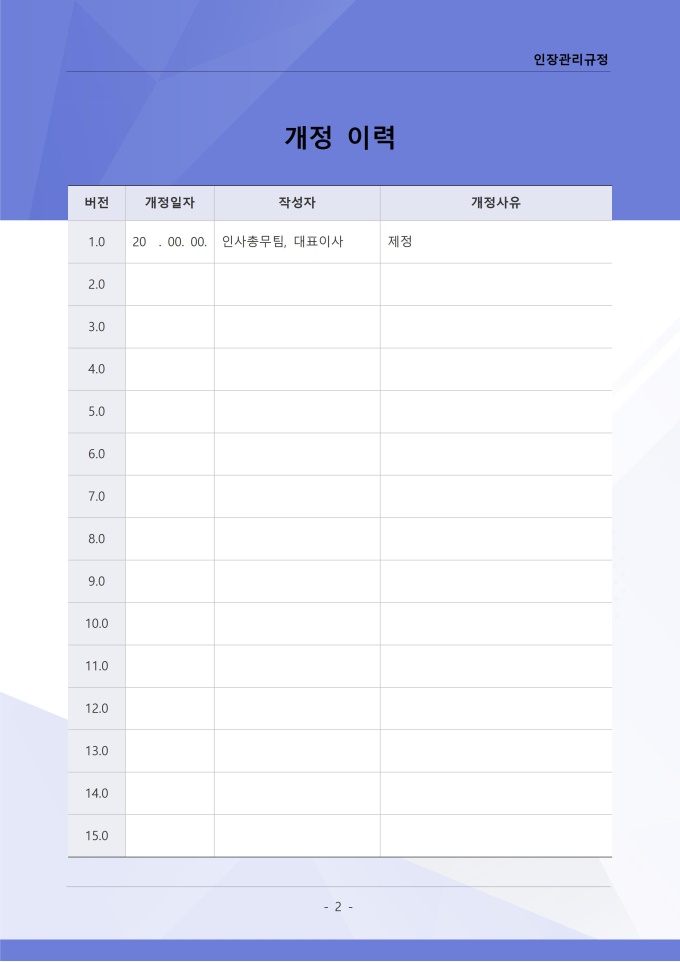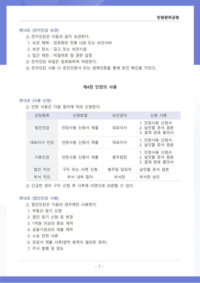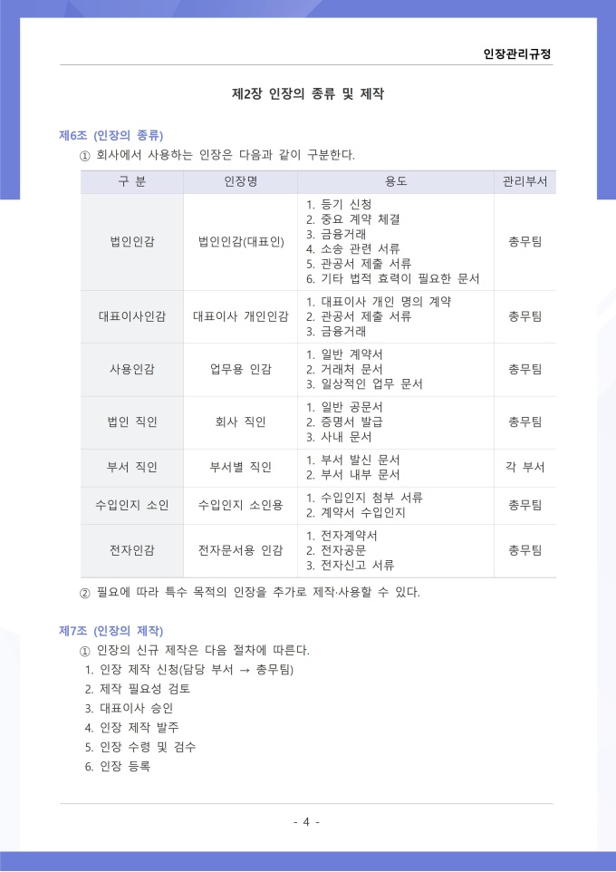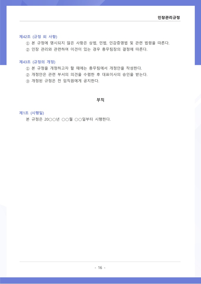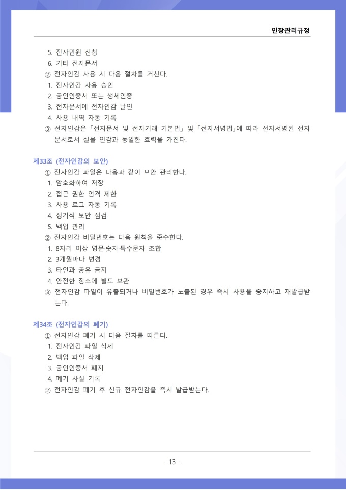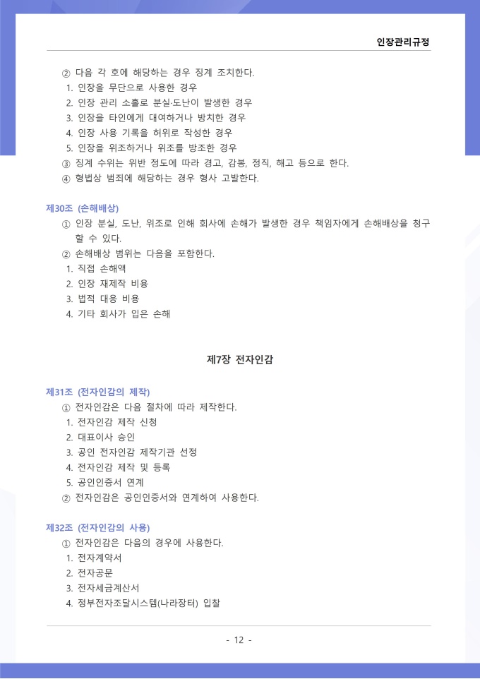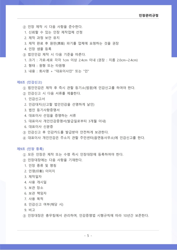 9,000원/월인장관리 규정 서식입니다. 인장관리 규정은 조직 내에서 사용되는 각종 인장의 제작, 보관, 사용 및 폐기에 관한 전반적인 사항을 규정하는 문서입니다. 이 규정에는 법인인감, 사용인감, 업무인감 등 인장의 종류별 관리 책임자와 사용 절차가 명시되어 있습니다. [회사 규정 패키지]는 취업규칙, 인사규정, 복무규정, 상벌규정, 경조사규정, 여비규정 등 조직 운영에 필수적인 각종 사규와 내규를 체계적으로 정립하는 데 필요한 다양한 서식들을 패키지로 제공합니다. 해당 패키지를 통해 회사는 투명하고 일관된 인사 및 조직 관리 기준을 마련할 수 있으며, 구성원들은 명확한 규정에 따라 권리를 보호받고 의무를 준수할 수 있습니다.