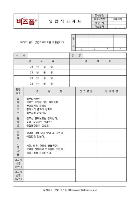 영업사원을 평가할 때 사용하는 영업직고과표입니다. 검사일, 검사자, 관찰점, 전기평점, 당기평점 등의 항목으로 구성되어있으며 검사자는 객관적인 평가를 실시해야합니다.
