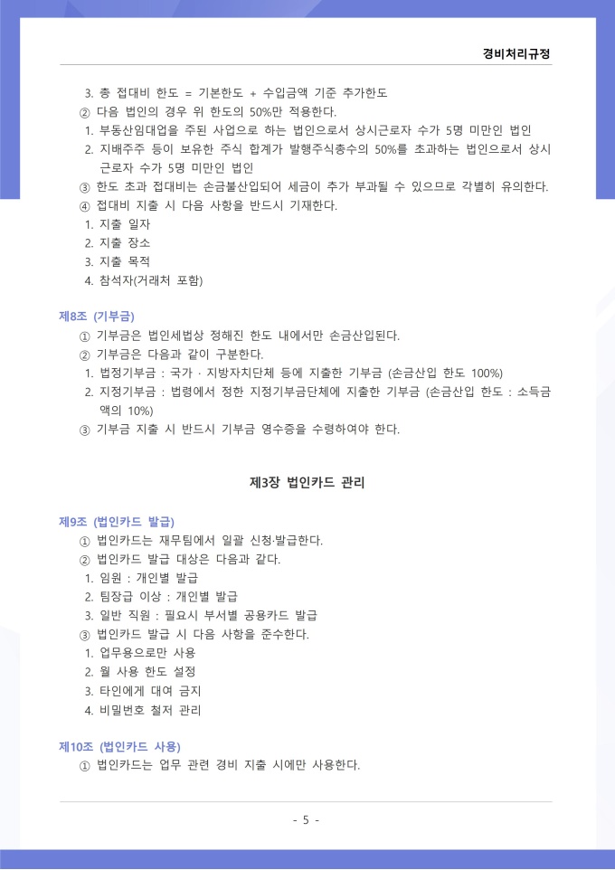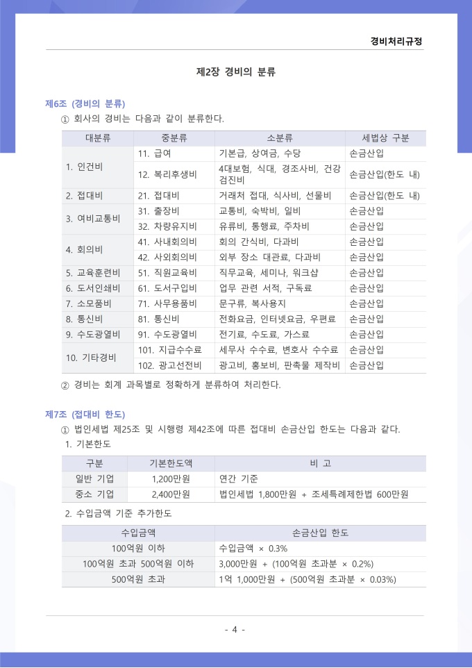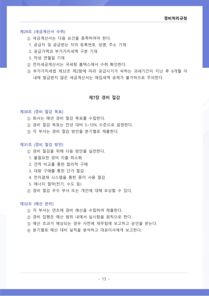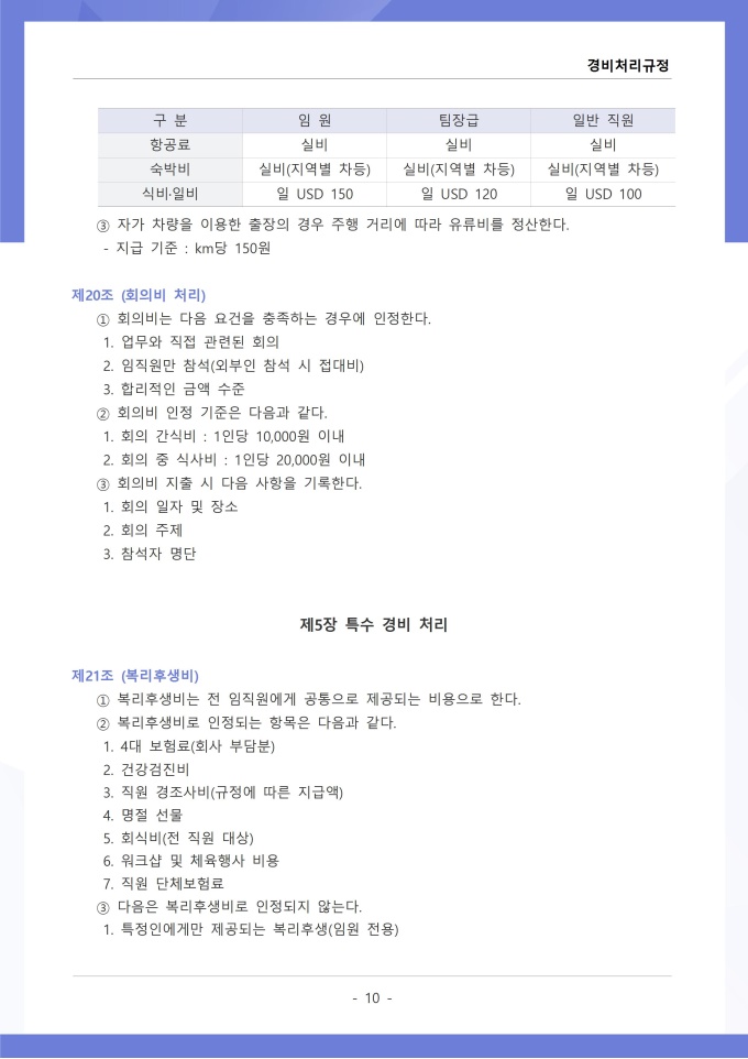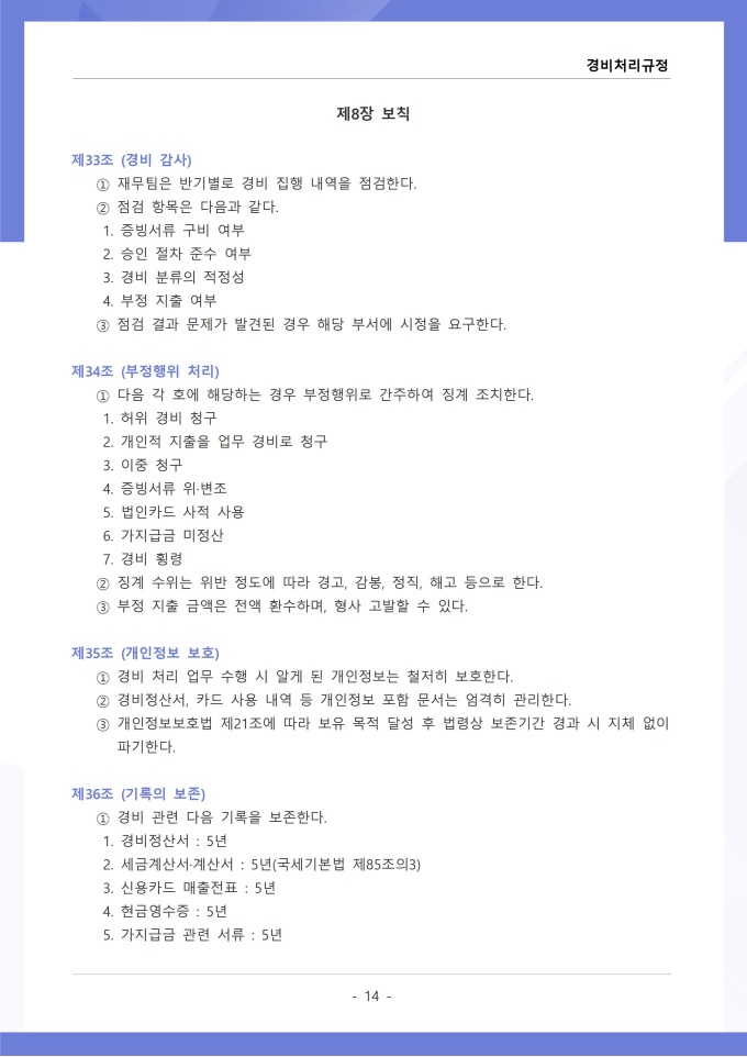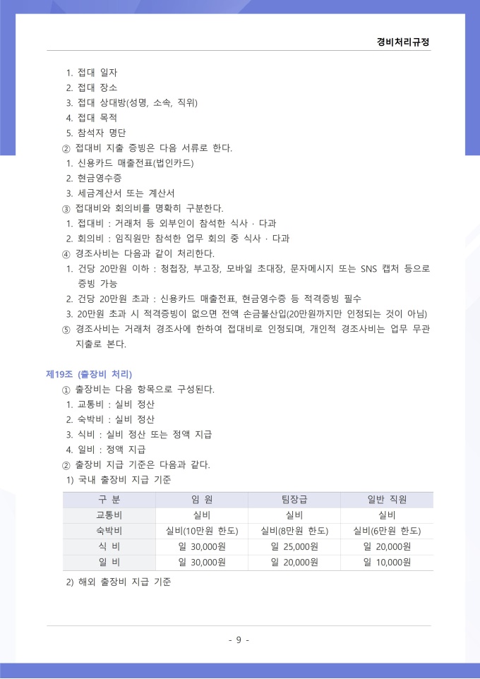 9,000원/월경비처리 규정은 조직의 업무 수행 과정에서 발생하는 각종 경비의 집행, 승인, 정산 및 회계 처리에 관한 사항을 정하는 문서입니다. 이 규정에는 여비, 접대비 등 경비 항목별 사용 기준과 한도액, 결재권자의 승인 범위가 명시되어 있습니다. [회사 규정 패키지]는 취업규칙, 인사규정, 복무규정, 상벌규정, 경조사규정, 여비규정 등 조직 운영에 필수적인 각종 사규와 내규를 체계적으로 정립하는 데 필요한 다양한 서식들을 패키지로 제공합니다. 해당 패키지를 통해 회사는 투명하고 일관된 인사 및 조직 관리 기준을 마련할 수 있으며, 구성원들은 명확한 규정에 따라 권리를 보호받고 의무를 준수할 수 있습니다.