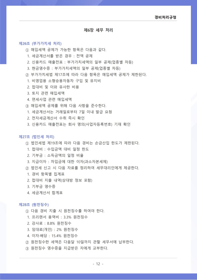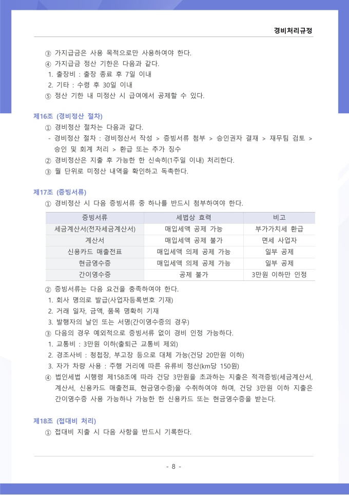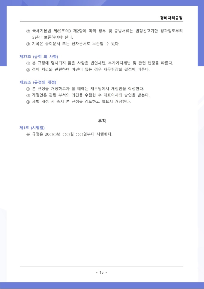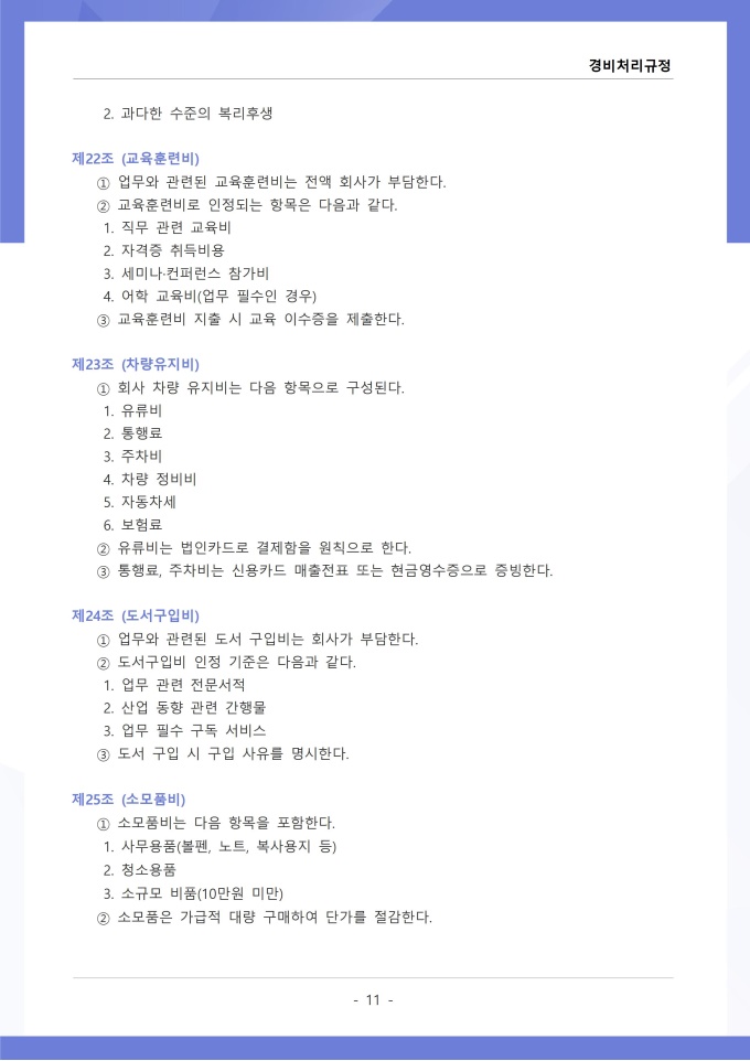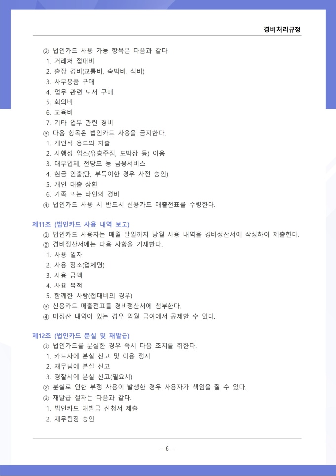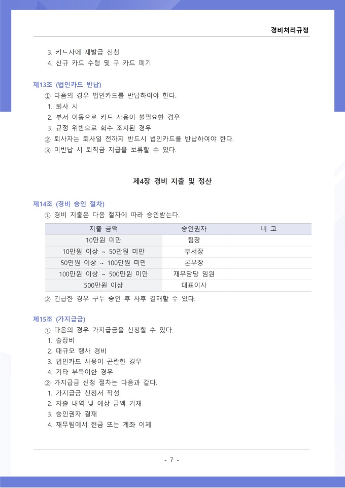 9,000원/월경비처리 규정은 조직의 업무 수행 과정에서 발생하는 각종 경비의 집행, 승인, 정산 및 회계 처리에 관한 사항을 정하는 문서입니다. 이 규정에는 여비, 접대비 등 경비 항목별 사용 기준과 한도액, 결재권자의 승인 범위가 명시되어 있습니다. [회사 규정 패키지]는 취업규칙, 인사규정, 복무규정, 상벌규정, 경조사규정, 여비규정 등 조직 운영에 필수적인 각종 사규와 내규를 체계적으로 정립하는 데 필요한 다양한 서식들을 패키지로 제공합니다. 해당 패키지를 통해 회사는 투명하고 일관된 인사 및 조직 관리 기준을 마련할 수 있으며, 구성원들은 명확한 규정에 따라 권리를 보호받고 의무를 준수할 수 있습니다.