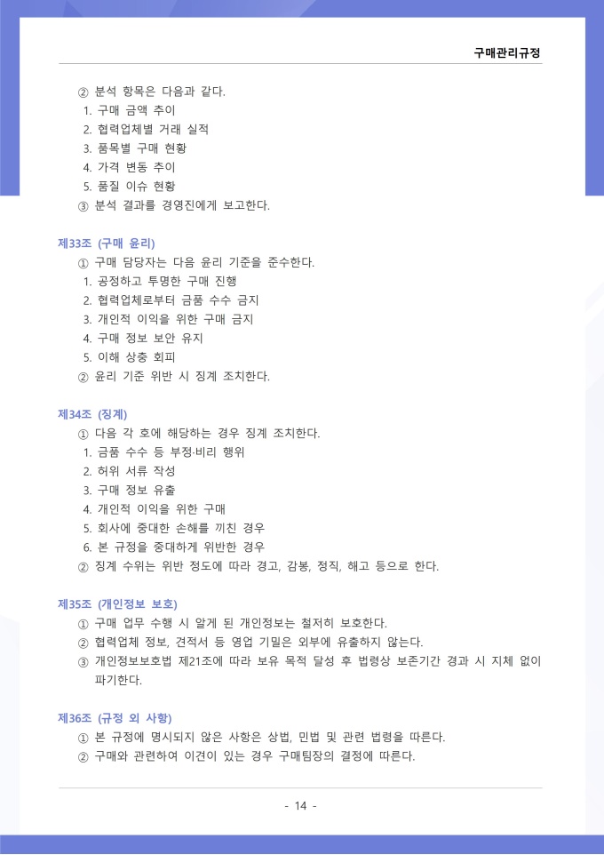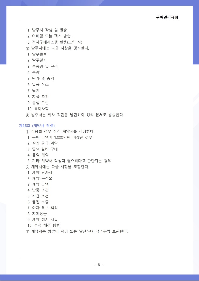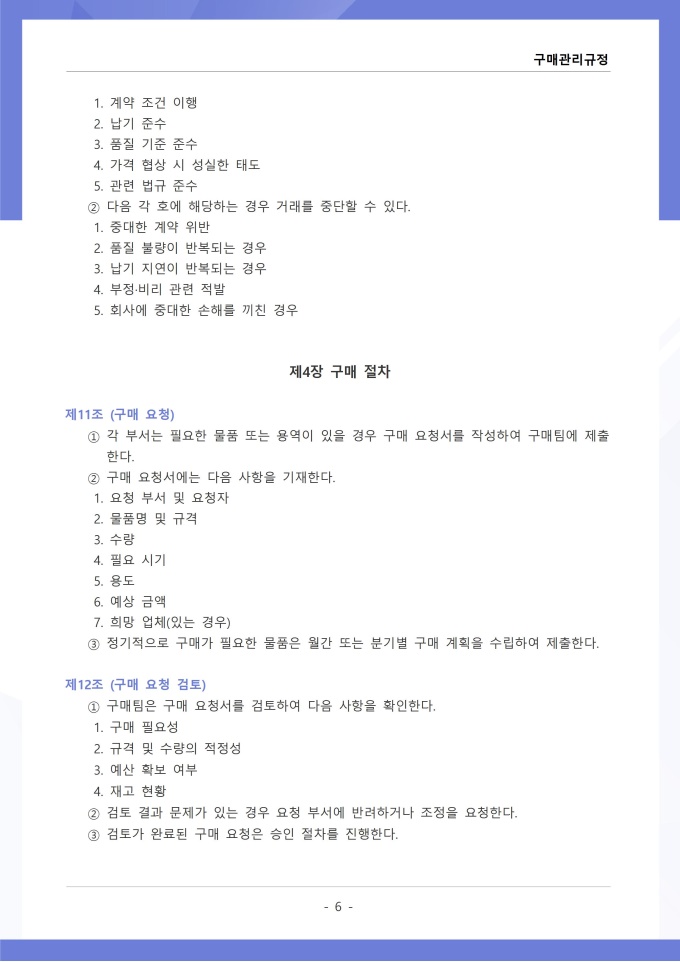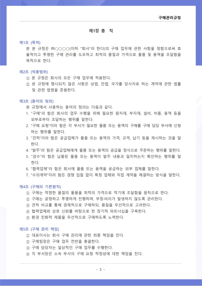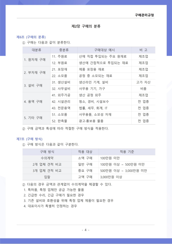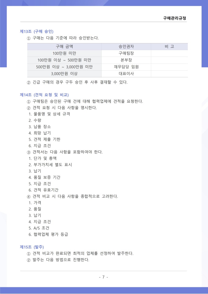 9,000원/월구매관리 규정은 조직에서 필요한 물품, 자재, 용역 등을 구매하는 과정의 신청, 검토, 발주, 검수 및 대금 지급에 관한 사항을 정하는 문서입니다. 이 규정에는 구매 요청 절차와 금액별 결재 권한, 거래처 선정 기준 및 경쟁입찰 또는 수의계약 적용 범위가 명시되어 있습니다. [회사 규정 패키지]는 취업규칙, 인사규정, 복무규정, 상벌규정, 경조사규정, 여비규정 등 조직 운영에 필수적인 각종 사규와 내규를 체계적으로 정립하는 데 필요한 다양한 서식들을 패키지로 제공합니다. 해당 패키지를 통해 회사는 투명하고 일관된 인사 및 조직 관리 기준을 마련할 수 있으며, 구성원들은 명확한 규정에 따라 권리를 보호받고 의무를 준수할 수 있습니다.