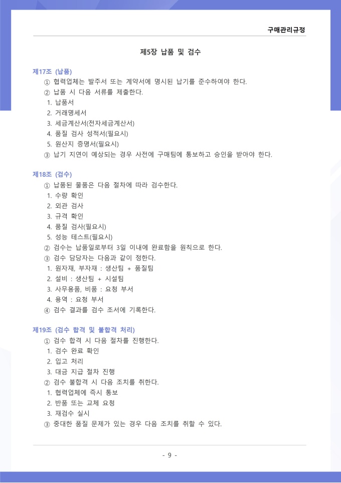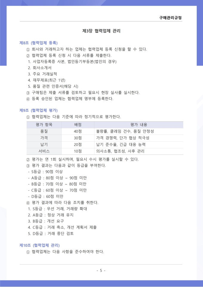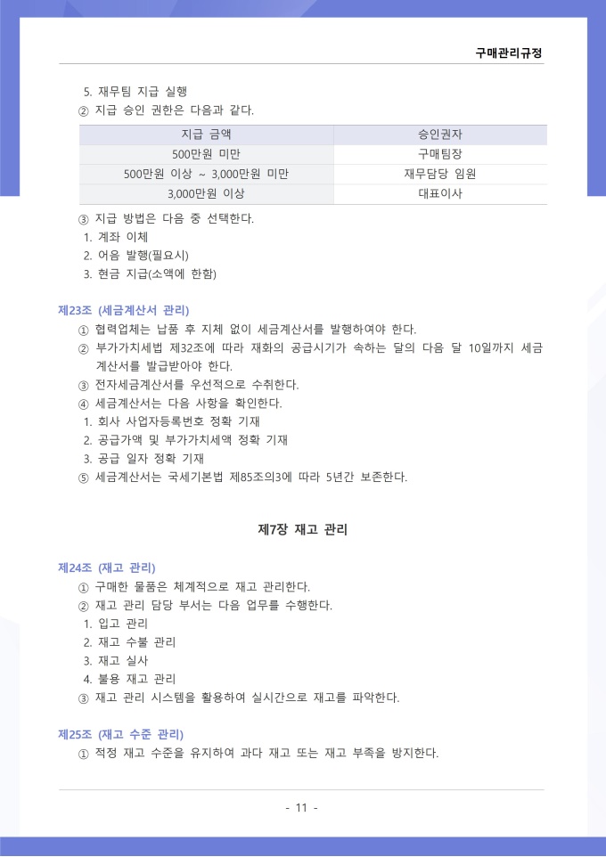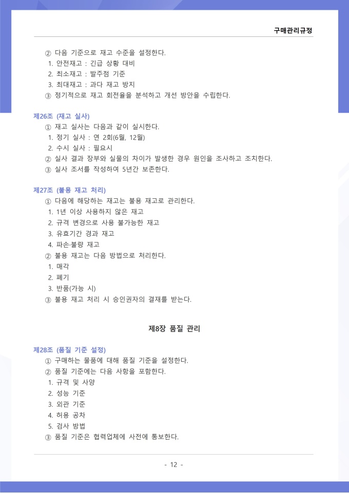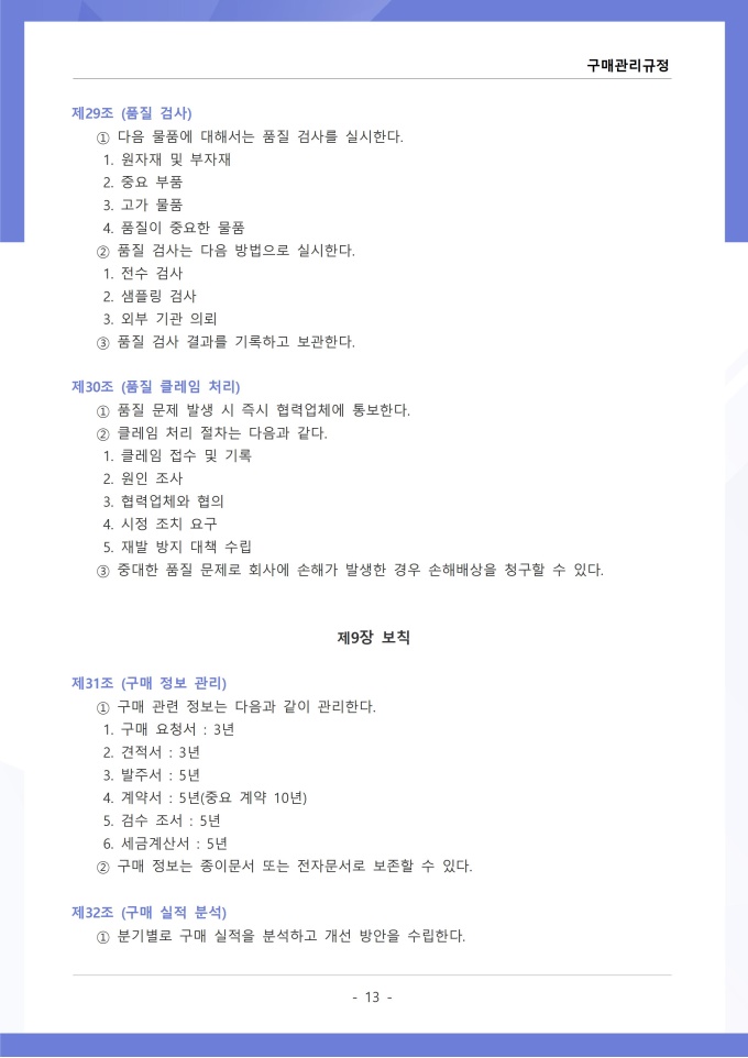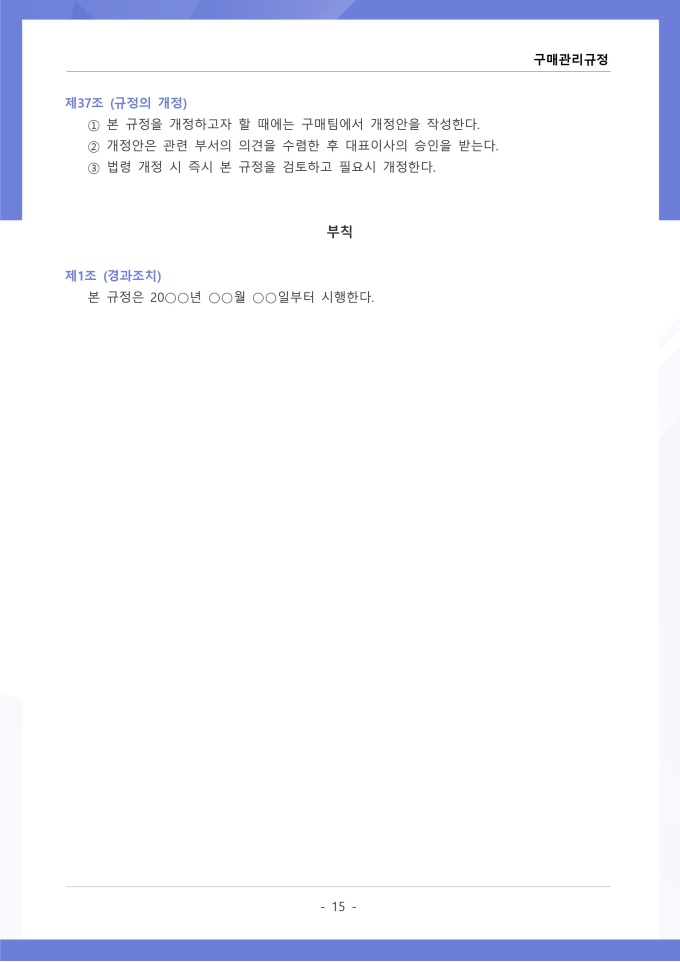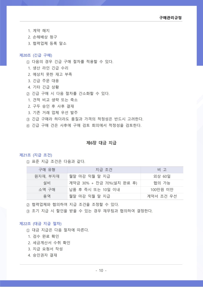 9,000원/월구매관리 규정은 조직에서 필요한 물품, 자재, 용역 등을 구매하는 과정의 신청, 검토, 발주, 검수 및 대금 지급에 관한 사항을 정하는 문서입니다. 이 규정에는 구매 요청 절차와 금액별 결재 권한, 거래처 선정 기준 및 경쟁입찰 또는 수의계약 적용 범위가 명시되어 있습니다. [회사 규정 패키지]는 취업규칙, 인사규정, 복무규정, 상벌규정, 경조사규정, 여비규정 등 조직 운영에 필수적인 각종 사규와 내규를 체계적으로 정립하는 데 필요한 다양한 서식들을 패키지로 제공합니다. 해당 패키지를 통해 회사는 투명하고 일관된 인사 및 조직 관리 기준을 마련할 수 있으며, 구성원들은 명확한 규정에 따라 권리를 보호받고 의무를 준수할 수 있습니다.