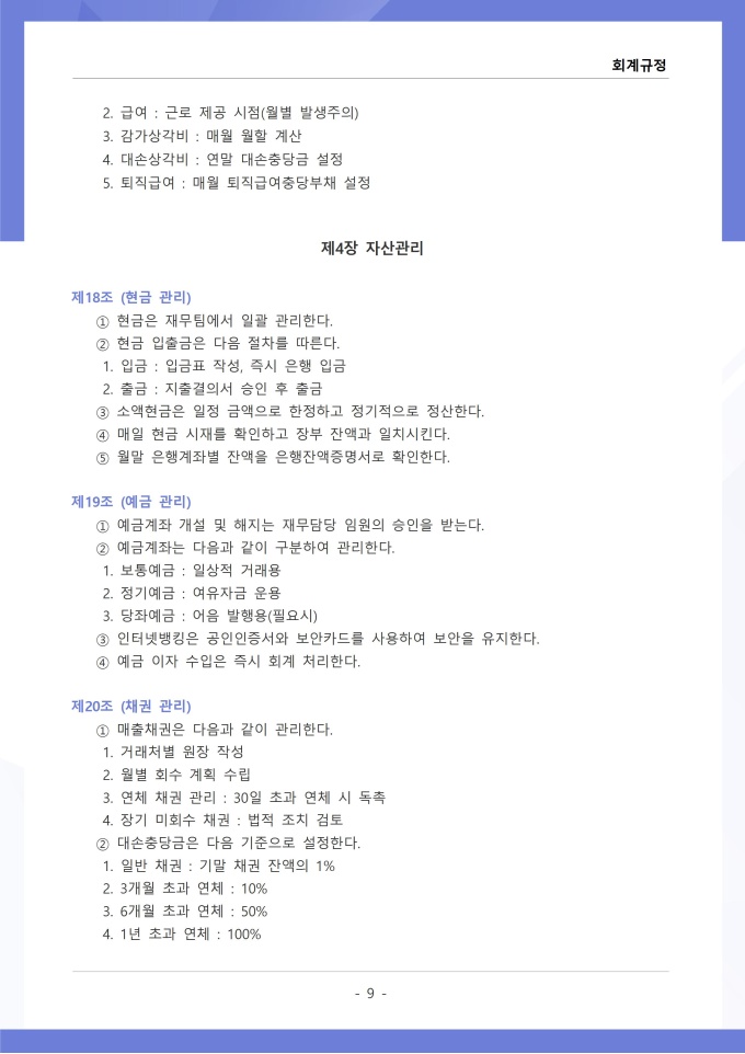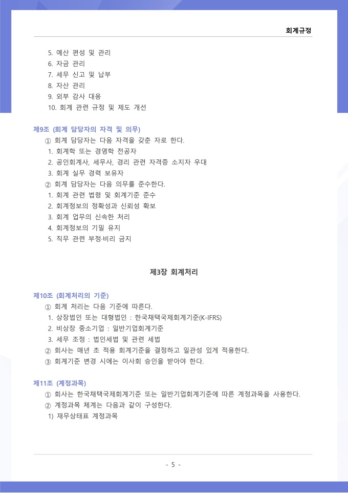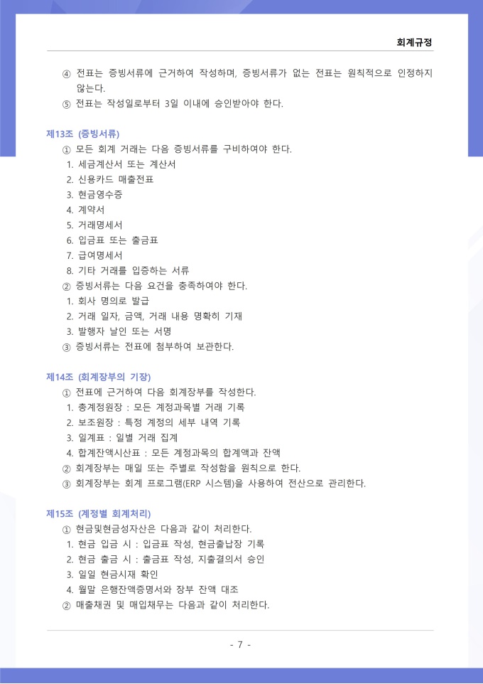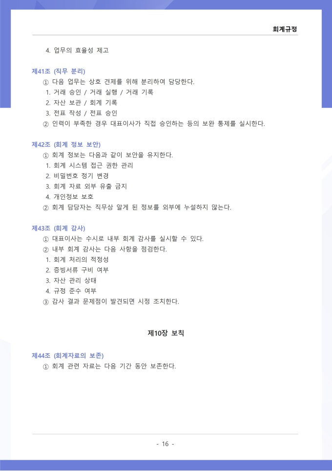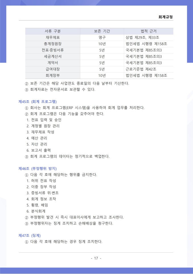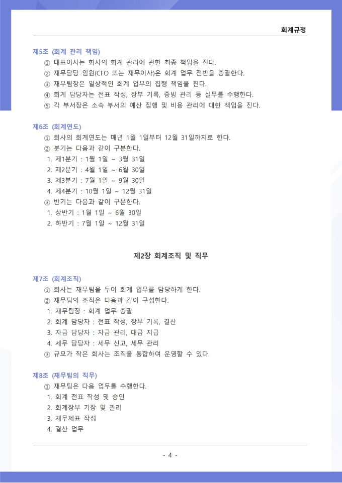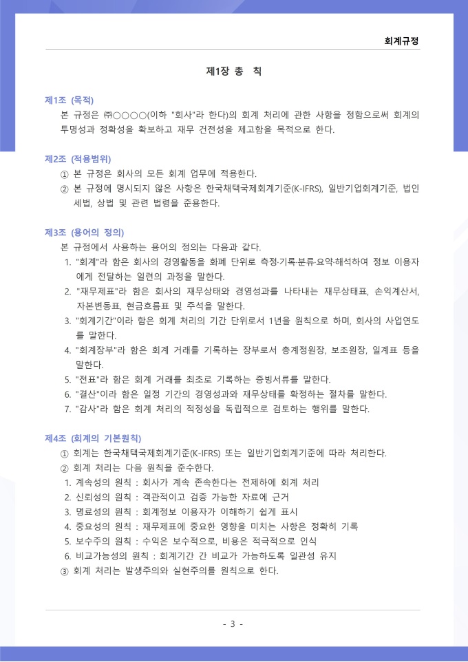 9,000원/월회계규정은 조직의 모든 재무 거래와 관련된 회계 처리 기준, 장부 작성, 결산 및 보고 절차를 정하는 문서입니다. 이 규정에는 수입과 지출의 인식 기준, 계정과목별 분류 방법, 전표 작성 및 승인 절차가 명시되어 있습니다. [회사 규정 패키지]는 취업규칙, 인사규정, 복무규정, 상벌규정, 경조사규정, 여비규정 등 조직 운영에 필수적인 각종 사규와 내규를 체계적으로 정립하는 데 필요한 다양한 서식들을 패키지로 제공합니다. 해당 패키지를 통해 회사는 투명하고 일관된 인사 및 조직 관리 기준을 마련할 수 있으며, 구성원들은 명확한 규정에 따라 권리를 보호받고 의무를 준수할 수 있습니다.