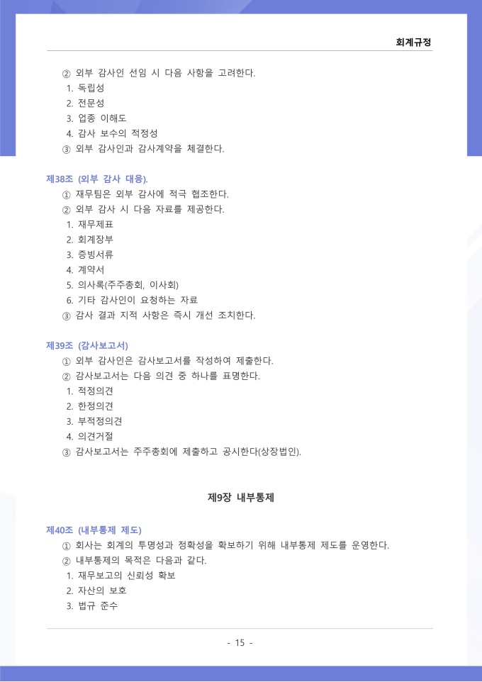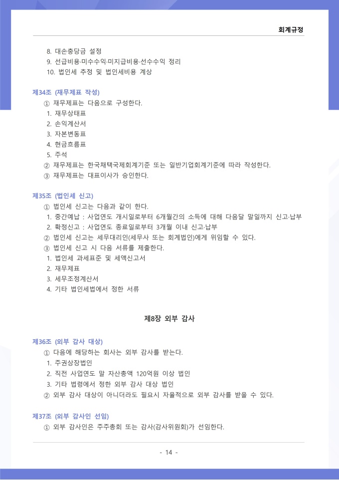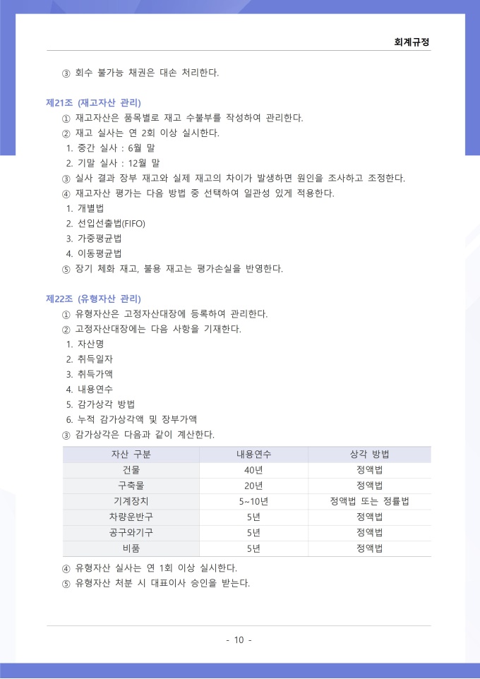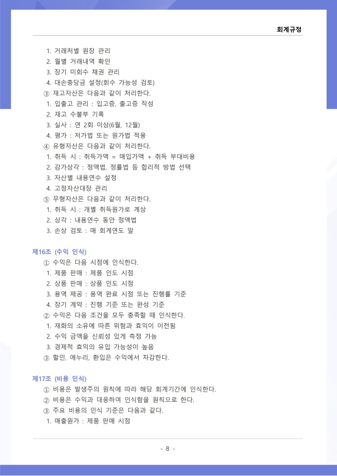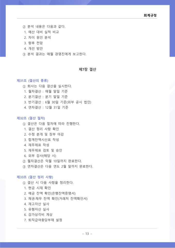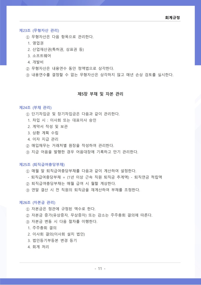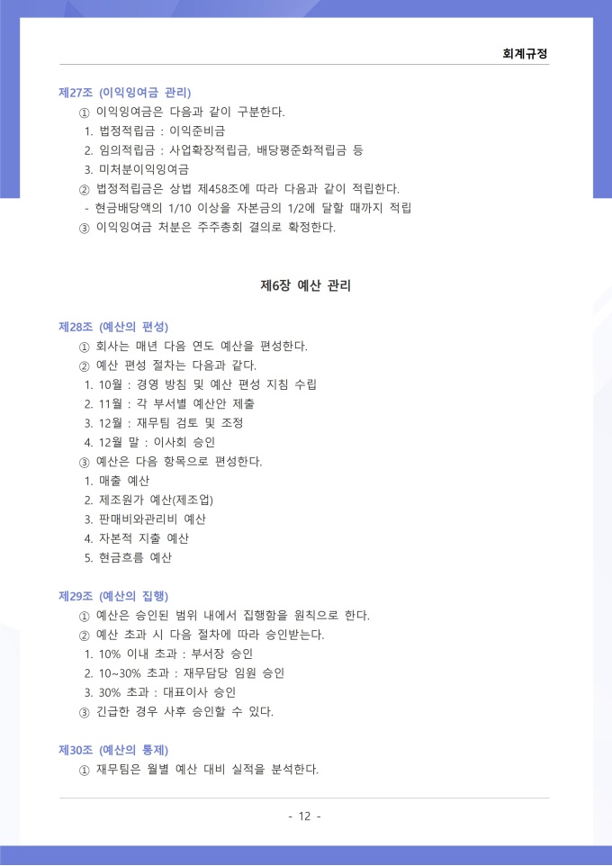 9,000원/월회계규정은 조직의 모든 재무 거래와 관련된 회계 처리 기준, 장부 작성, 결산 및 보고 절차를 정하는 문서입니다. 이 규정에는 수입과 지출의 인식 기준, 계정과목별 분류 방법, 전표 작성 및 승인 절차가 명시되어 있습니다. [회사 규정 패키지]는 취업규칙, 인사규정, 복무규정, 상벌규정, 경조사규정, 여비규정 등 조직 운영에 필수적인 각종 사규와 내규를 체계적으로 정립하는 데 필요한 다양한 서식들을 패키지로 제공합니다. 해당 패키지를 통해 회사는 투명하고 일관된 인사 및 조직 관리 기준을 마련할 수 있으며, 구성원들은 명확한 규정에 따라 권리를 보호받고 의무를 준수할 수 있습니다.