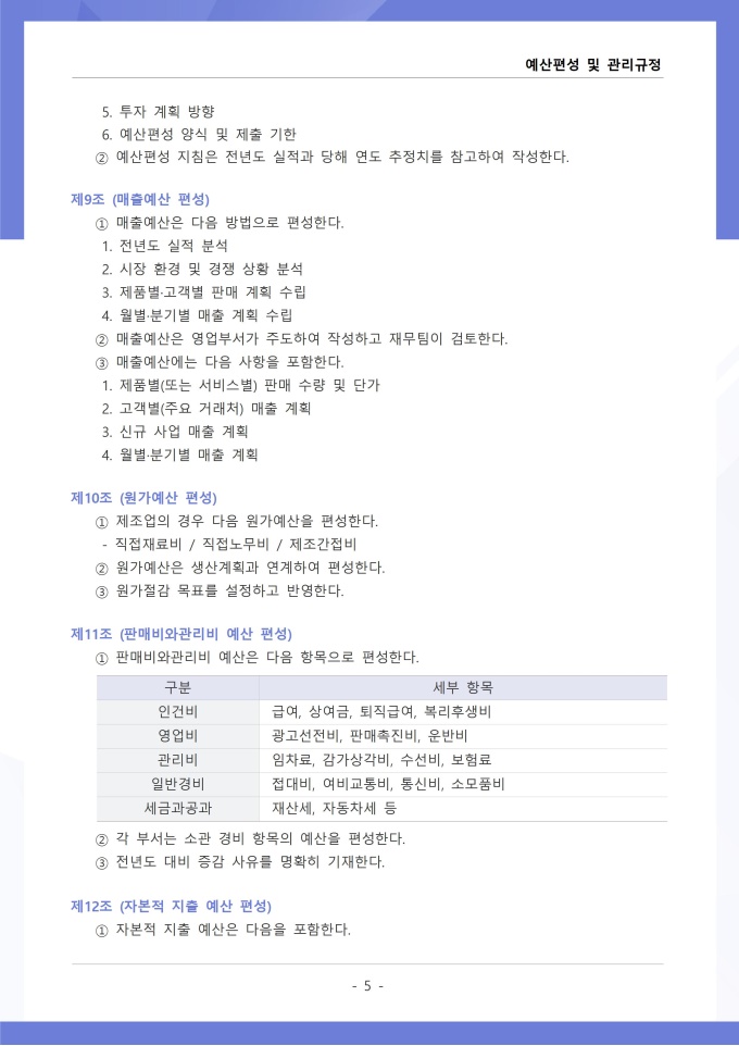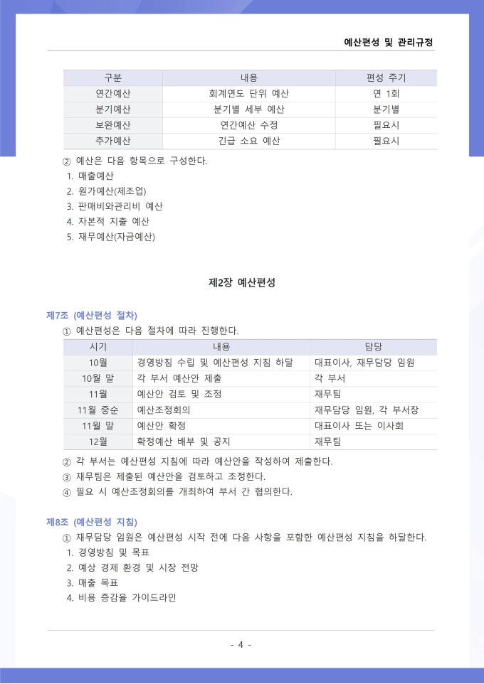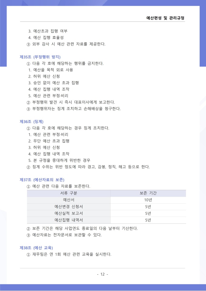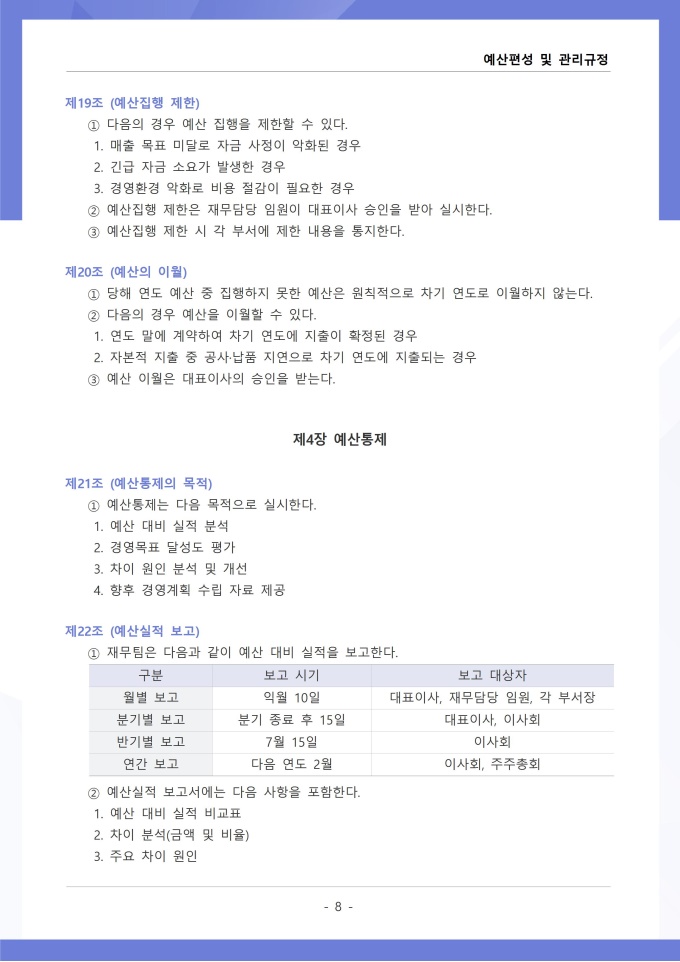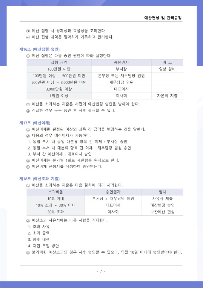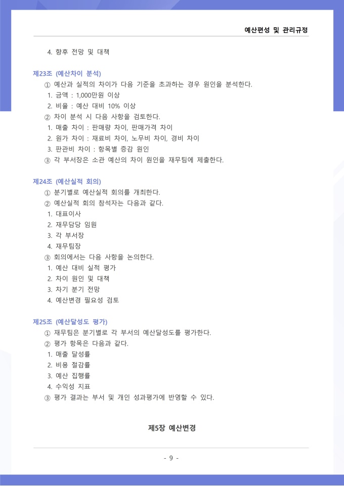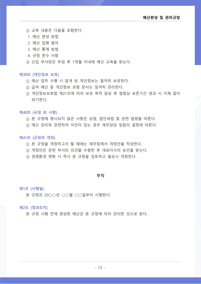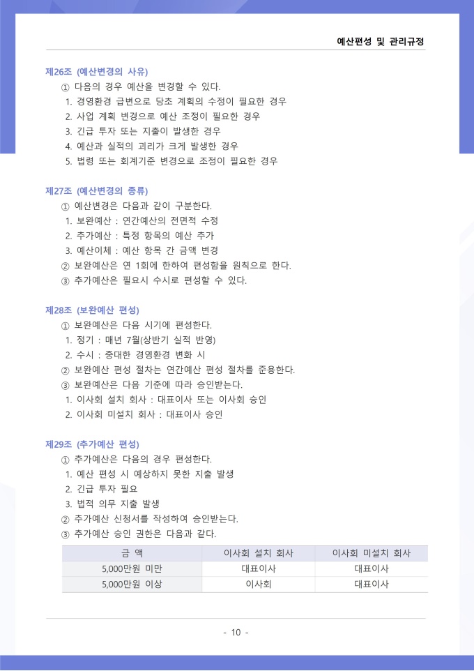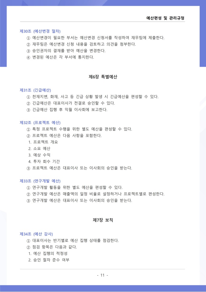 9,000원/월예산편성 및 관리 규정은 조직의 연간 예산 수립, 배정, 집행, 변경 등 전 과정의 절차와 원칙을 정하는 문서입니다. 확정된 예산의 집행 시 승인 권한, 예산 초과 또는 부족 발생 시 추가 편성이나 과목 간 전용 절차를 구체적으로 규정하고 있습니다. [회사 규정 패키지]는 취업규칙, 인사규정, 복무규정, 상벌규정, 경조사규정, 여비규정 등 조직 운영에 필수적인 각종 사규와 내규를 체계적으로 정립하는 데 필요한 다양한 서식들을 패키지로 제공합니다. 해당 패키지를 통해 회사는 투명하고 일관된 인사 및 조직 관리 기준을 마련할 수 있으며, 구성원들은 명확한 규정에 따라 권리를 보호받고 의무를 준수할 수 있습니다.
