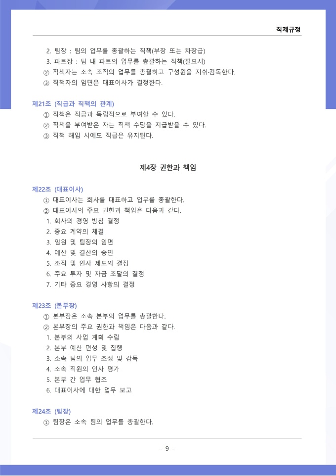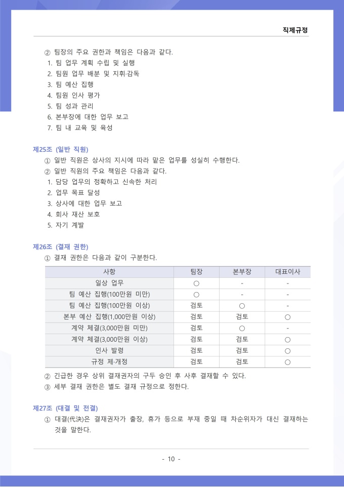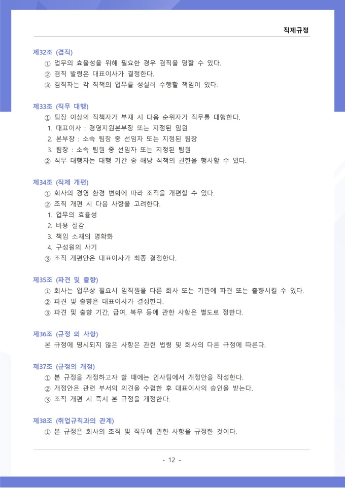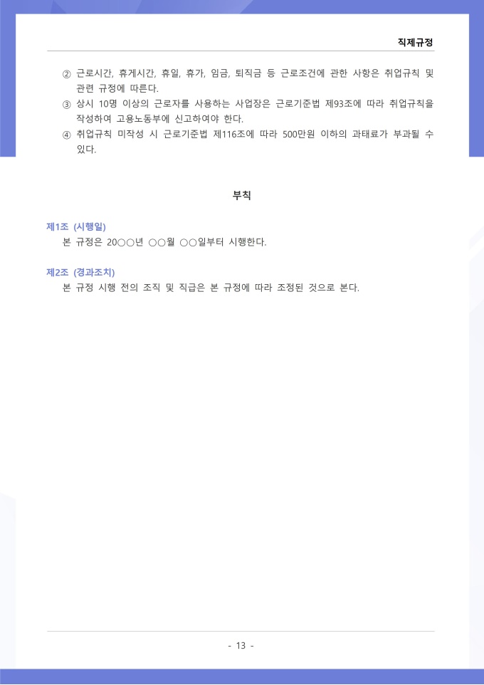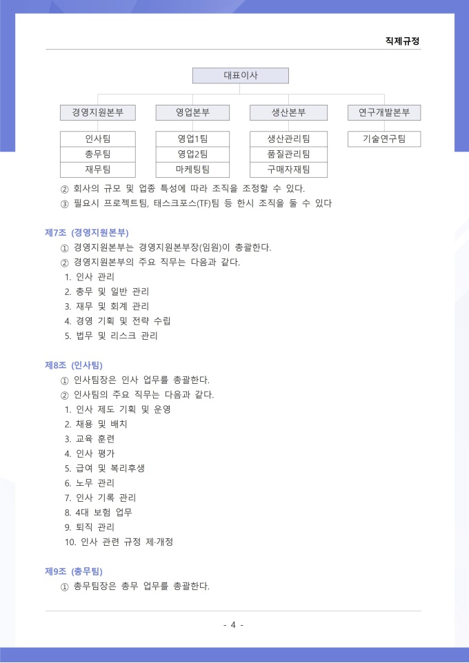 9,000원/월직제규정은 조직의 부서 구성, 직급 체계, 각 부서와 직위별 업무 분장 및 권한과 책임에 관한 사항을 정하는 문서입니다. 이 규정에는 본부, 부서, 팀 등 조직 단위의 명칭과 계층 구조, 각 부서의 설치 목적과 주요 업무 범위가 명시되어 있습니다. [회사 규정 패키지]는 취업규칙, 인사규정, 복무규정, 상벌규정, 경조사규정, 여비규정 등 조직 운영에 필수적인 각종 사규와 내규를 체계적으로 정립하는 데 필요한 다양한 서식들을 패키지로 제공합니다. 해당 패키지를 통해 회사는 투명하고 일관된 인사 및 조직 관리 기준을 마련할 수 있으며, 구성원들은 명확한 규정에 따라 권리를 보호받고 의무를 준수할 수 있습니다.