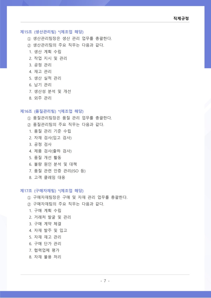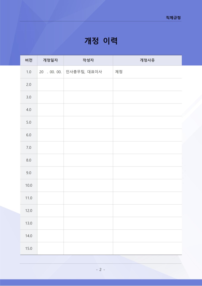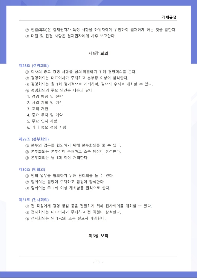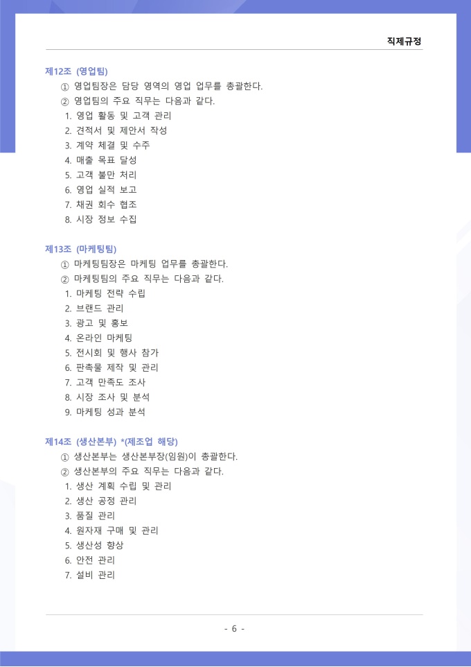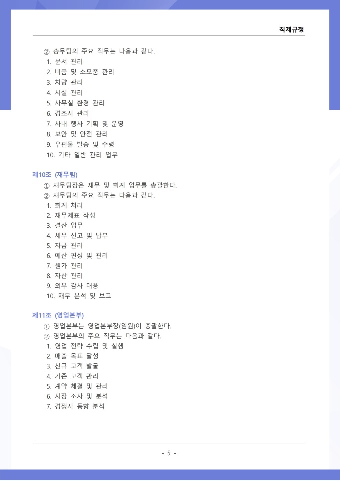 9,000원/월직제규정은 조직의 부서 구성, 직급 체계, 각 부서와 직위별 업무 분장 및 권한과 책임에 관한 사항을 정하는 문서입니다. 이 규정에는 본부, 부서, 팀 등 조직 단위의 명칭과 계층 구조, 각 부서의 설치 목적과 주요 업무 범위가 명시되어 있습니다. [회사 규정 패키지]는 취업규칙, 인사규정, 복무규정, 상벌규정, 경조사규정, 여비규정 등 조직 운영에 필수적인 각종 사규와 내규를 체계적으로 정립하는 데 필요한 다양한 서식들을 패키지로 제공합니다. 해당 패키지를 통해 회사는 투명하고 일관된 인사 및 조직 관리 기준을 마련할 수 있으며, 구성원들은 명확한 규정에 따라 권리를 보호받고 의무를 준수할 수 있습니다.