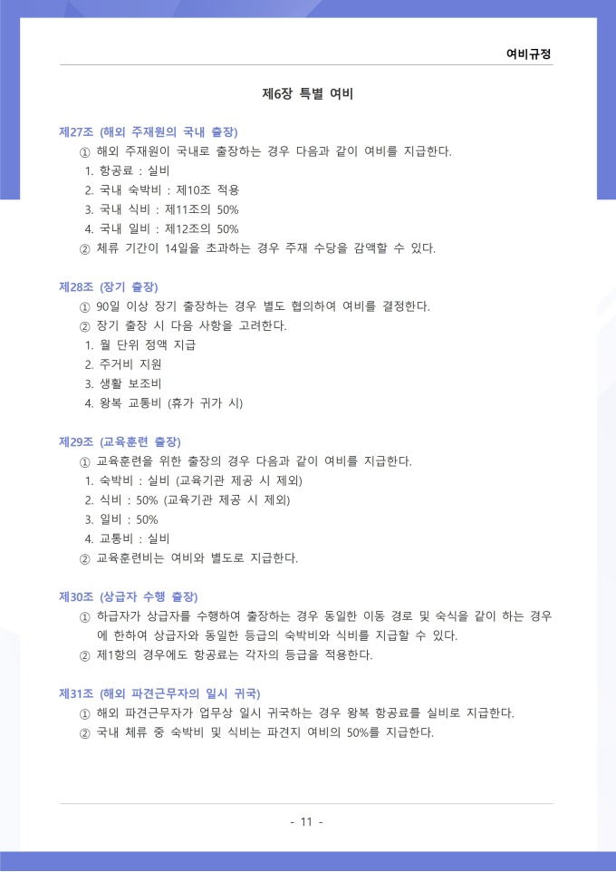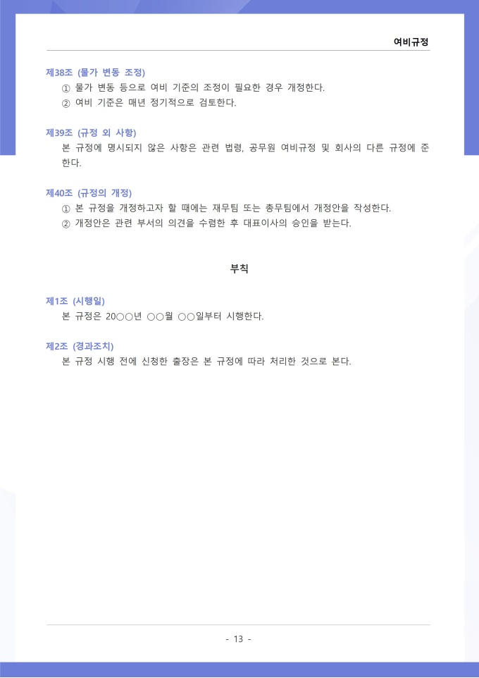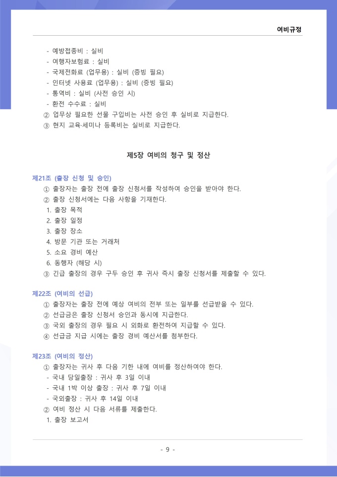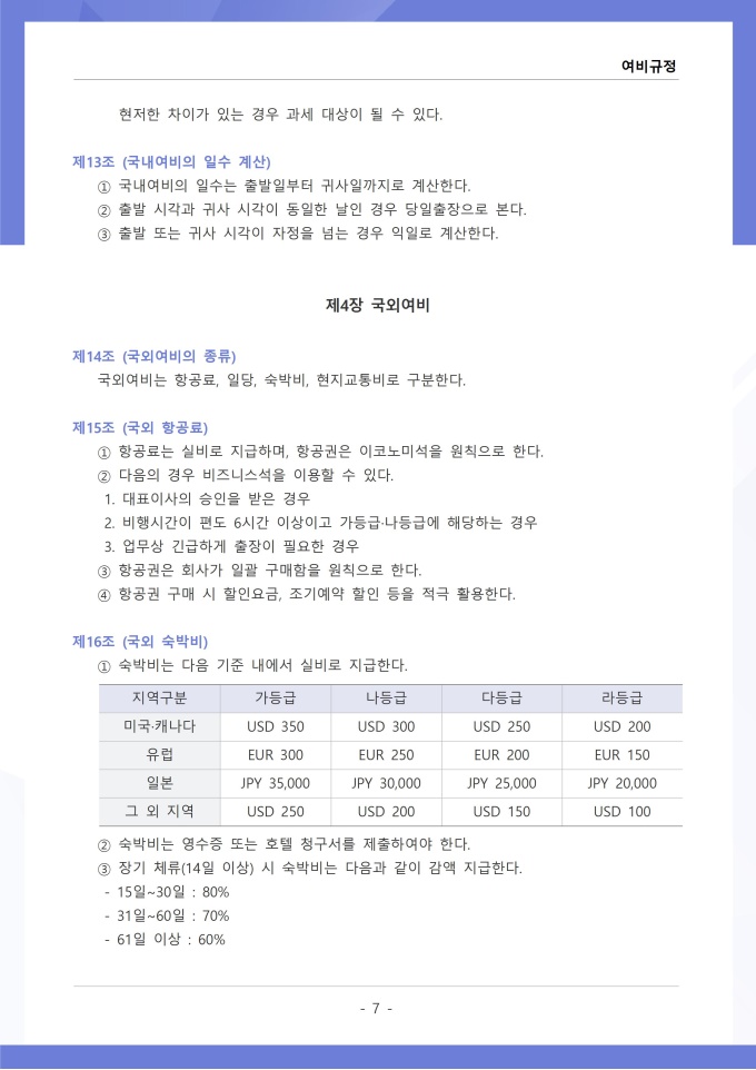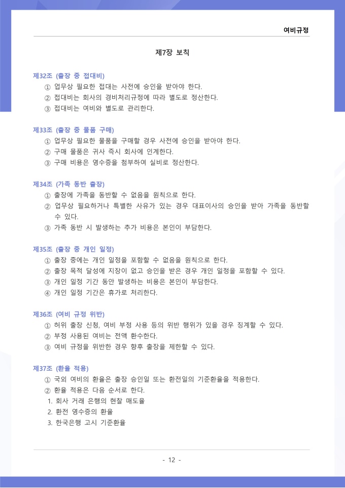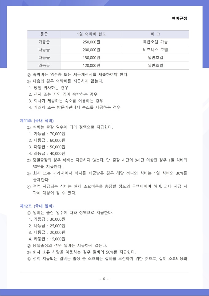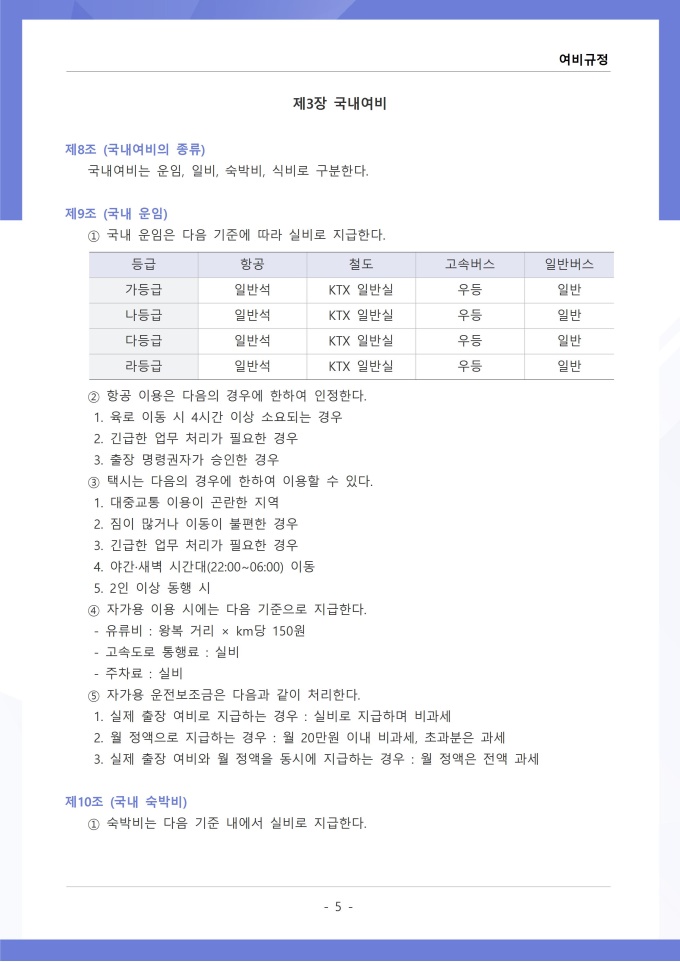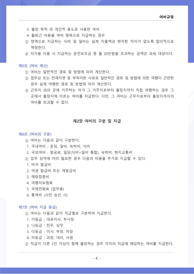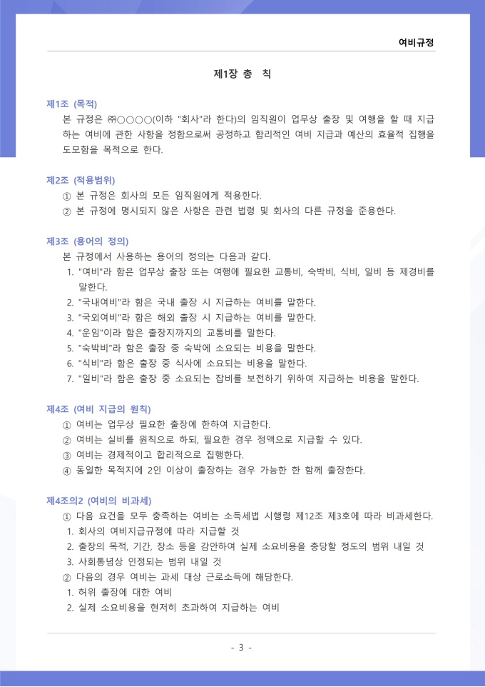 9,000원/월여비규정은 조직 구성원이 출장, 파견, 교육 등 업무상 이동 시 소요되는 교통비, 숙박비, 일비 등의 지급 기준과 절차를 정하는 문서입니다. 이 규정에는 직급별, 거리별, 출장 유형별 여비 항목과 금액, 교통수단 이용 등급 및 숙박시설 선택 기준이 명시되어 있습니다. [회사 규정 패키지]는 취업규칙, 인사규정, 복무규정, 상벌규정, 경조사규정, 여비규정 등 조직 운영에 필수적인 각종 사규와 내규를 체계적으로 정립하는 데 필요한 다양한 서식들을 패키지로 제공합니다. 해당 패키지를 통해 회사는 투명하고 일관된 인사 및 조직 관리 기준을 마련할 수 있으며, 구성원들은 명확한 규정에 따라 권리를 보호받고 의무를 준수할 수 있습니다.