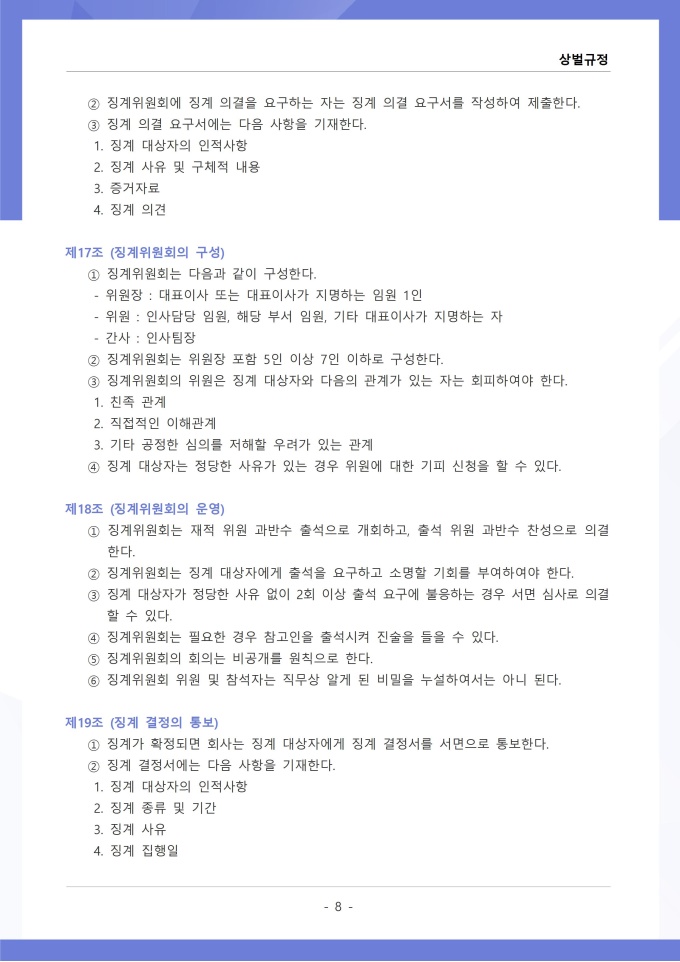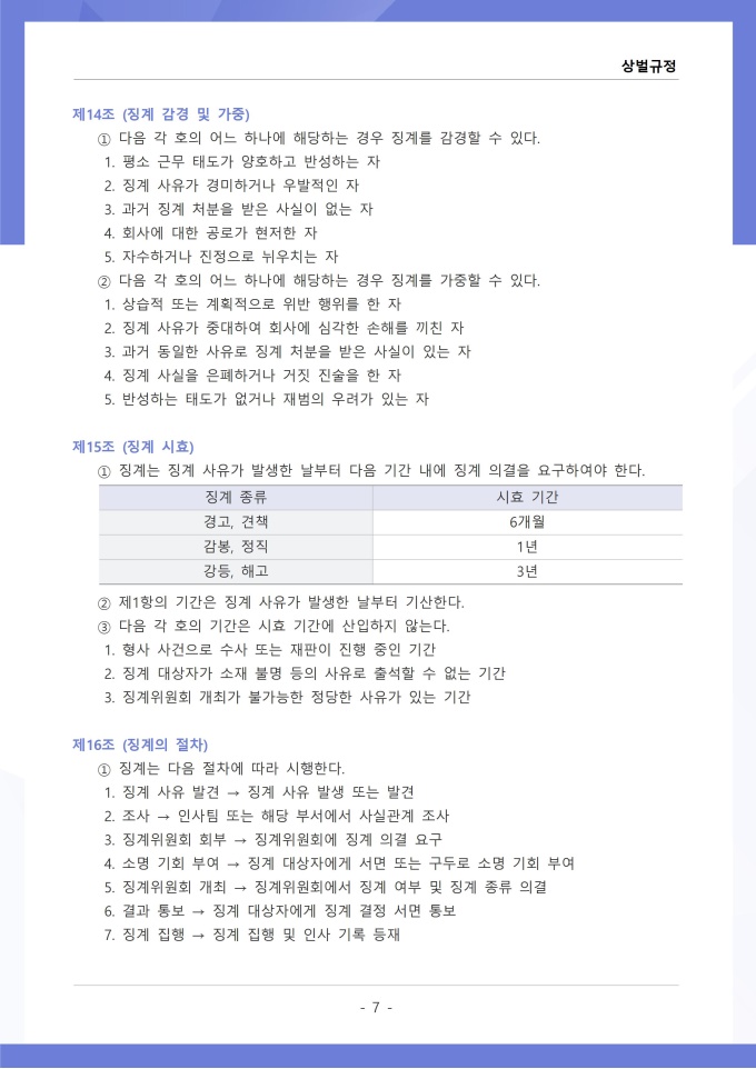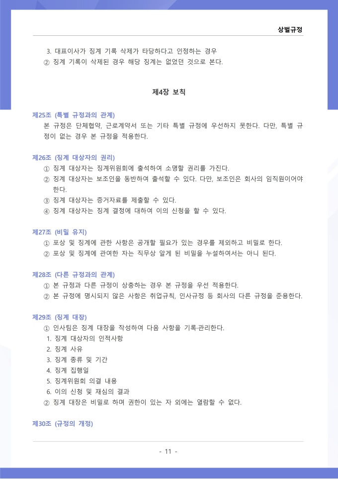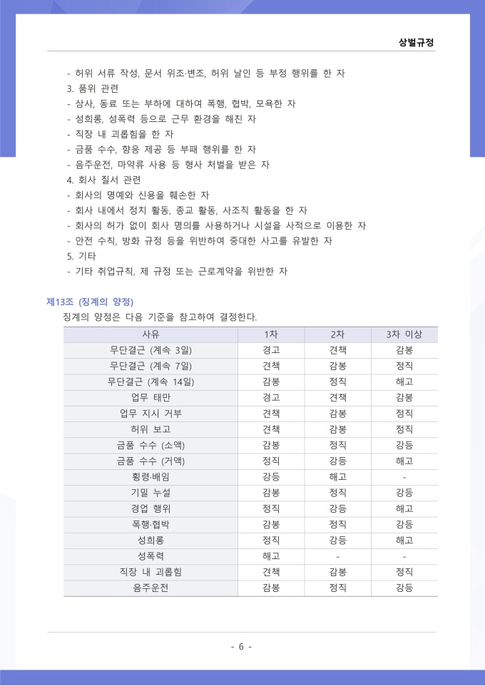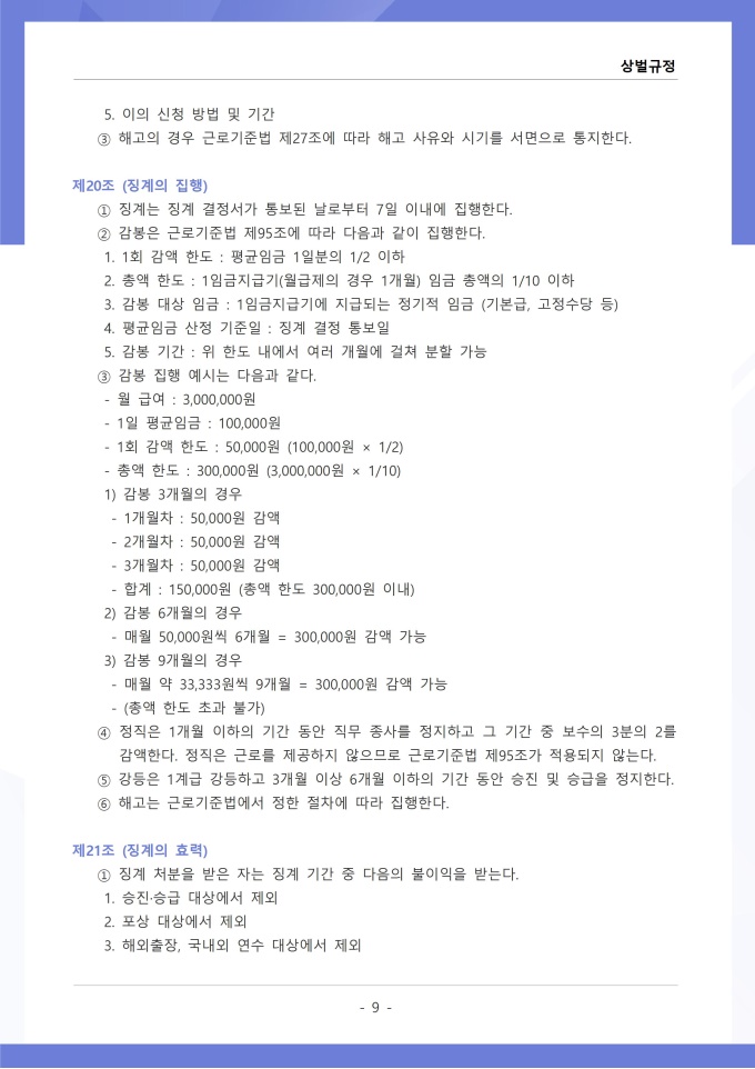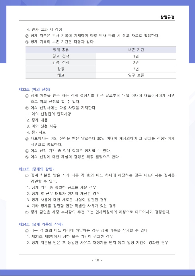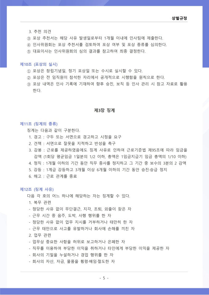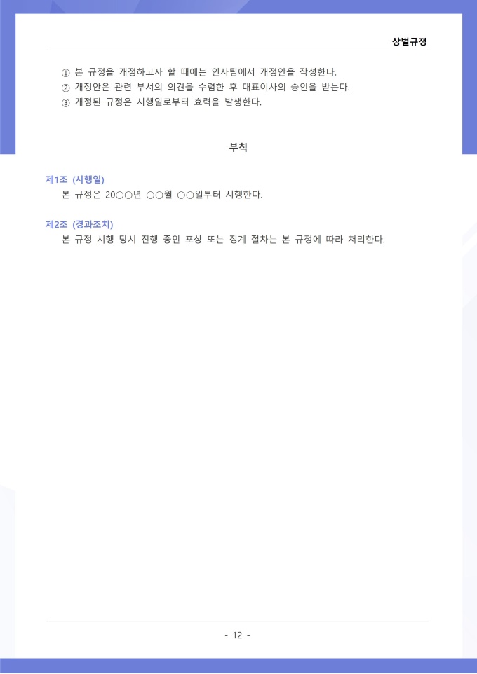 9,000원/월상벌규정은 조직 구성원의 업무 성과와 행동에 대한 포상 및 징계의 기준, 종류, 절차를 정하는 문서입니다. 이 규정에는 표창, 상금, 승급 등 포상의 유형과 대상 선정 기준 및 시상 시기 등 내용이 명시되어 있습니다. [회사 규정 패키지]는 취업규칙, 인사규정, 복무규정, 상벌규정, 경조사규정, 여비규정 등 조직 운영에 필수적인 각종 사규와 내규를 체계적으로 정립하는 데 필요한 다양한 서식들을 패키지로 제공합니다. 해당 패키지를 통해 회사는 투명하고 일관된 인사 및 조직 관리 기준을 마련할 수 있으며, 구성원들은 명확한 규정에 따라 권리를 보호받고 의무를 준수할 수 있습니다.