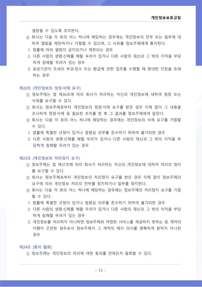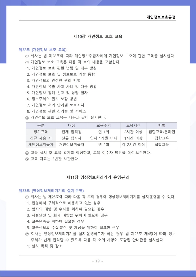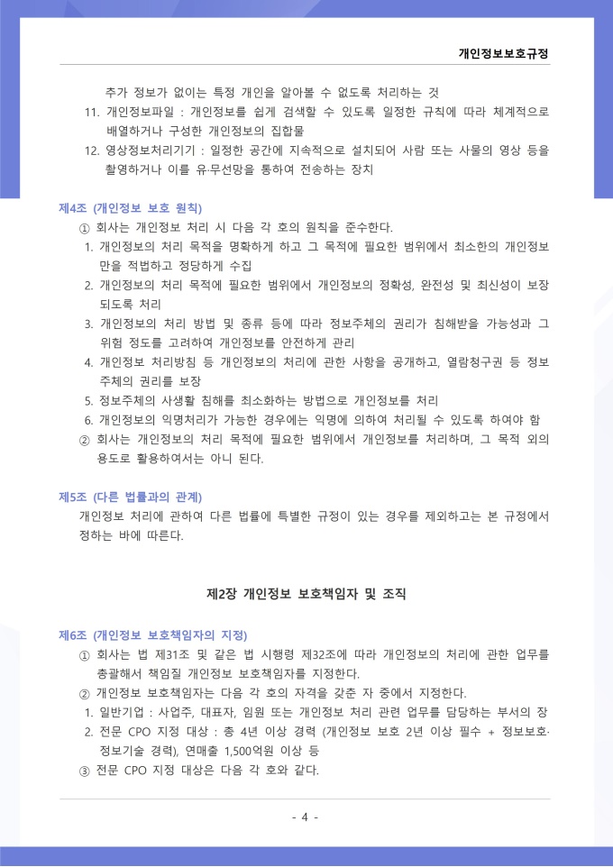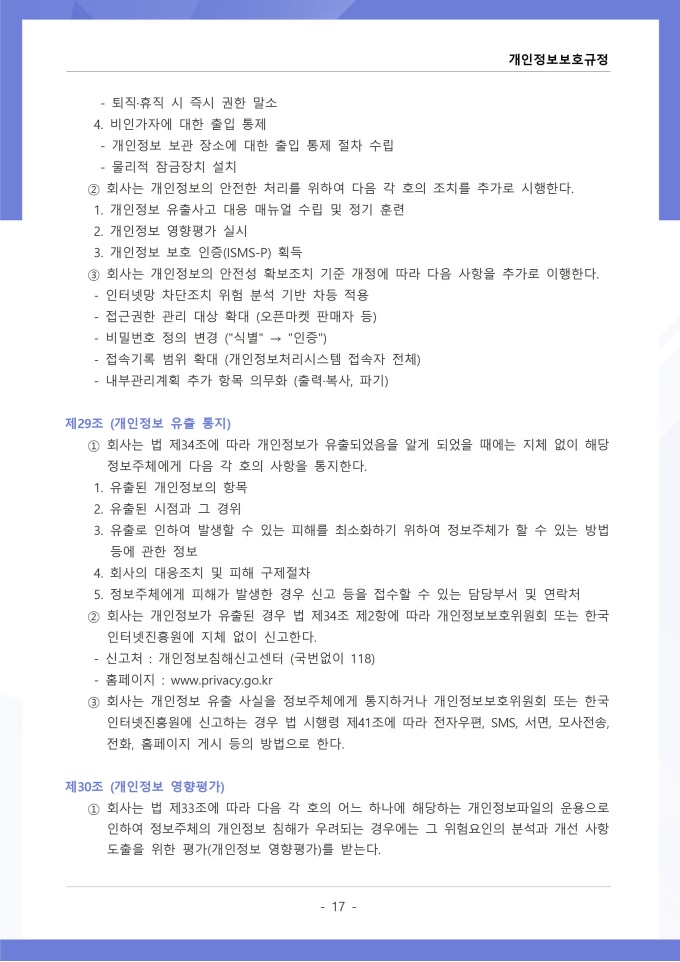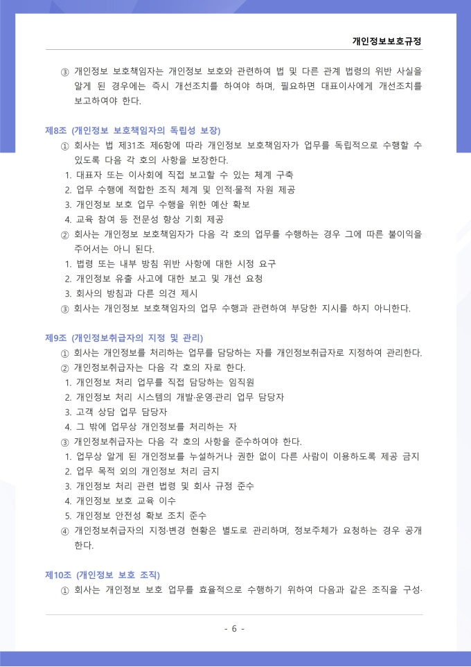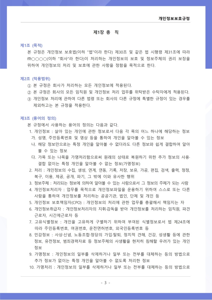 9,000원/월개인정보보호규정은 조직이 수집, 이용, 보관, 제공, 파기하는 개인정보의 처리 절차와 보호 대책에 관한 사항을 정하는 문서입니다. 이 규정에는 개인정보 수집 시 동의 절차와 수집 항목의 최소화 원칙, 목적 외 사용 금지 및 제3자 제공 시 고지 의무가 명시되어 있습니다. [회사 규정 패키지]는 취업규칙, 인사규정, 복무규정, 상벌규정, 경조사규정, 여비규정 등 조직 운영에 필수적인 각종 사규와 내규를 체계적으로 정립하는 데 필요한 다양한 서식들을 패키지로 제공합니다. 해당 패키지를 통해 회사는 투명하고 일관된 인사 및 조직 관리 기준을 마련할 수 있으며, 구성원들은 명확한 규정에 따라 권리를 보호받고 의무를 준수할 수 있습니다.
