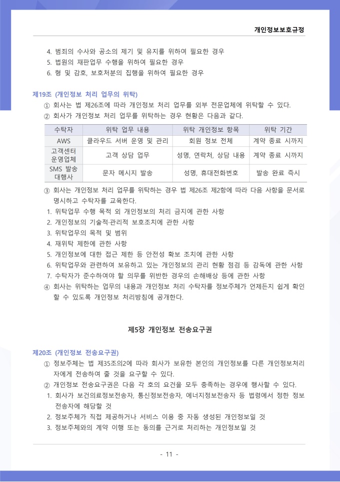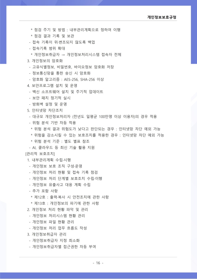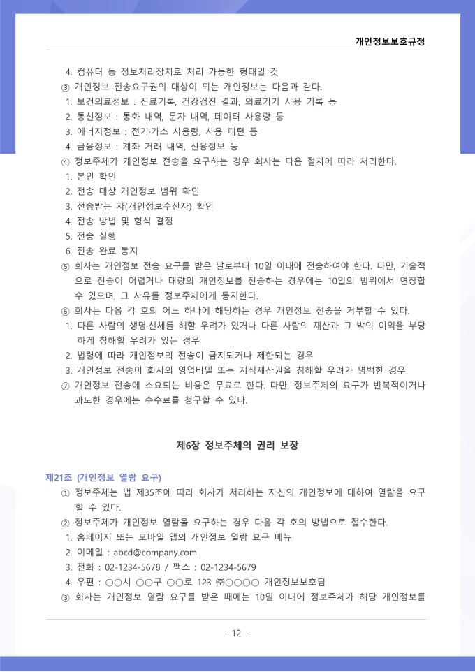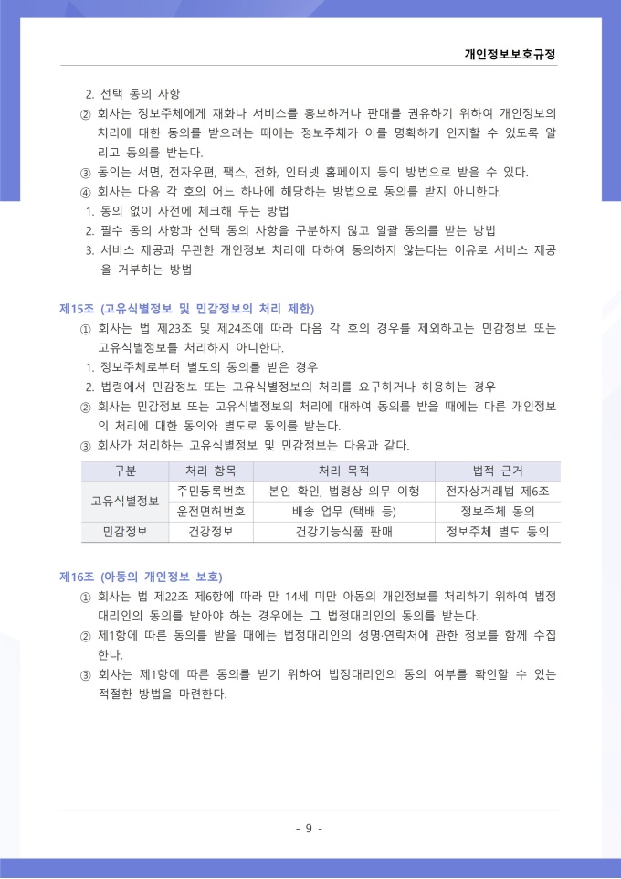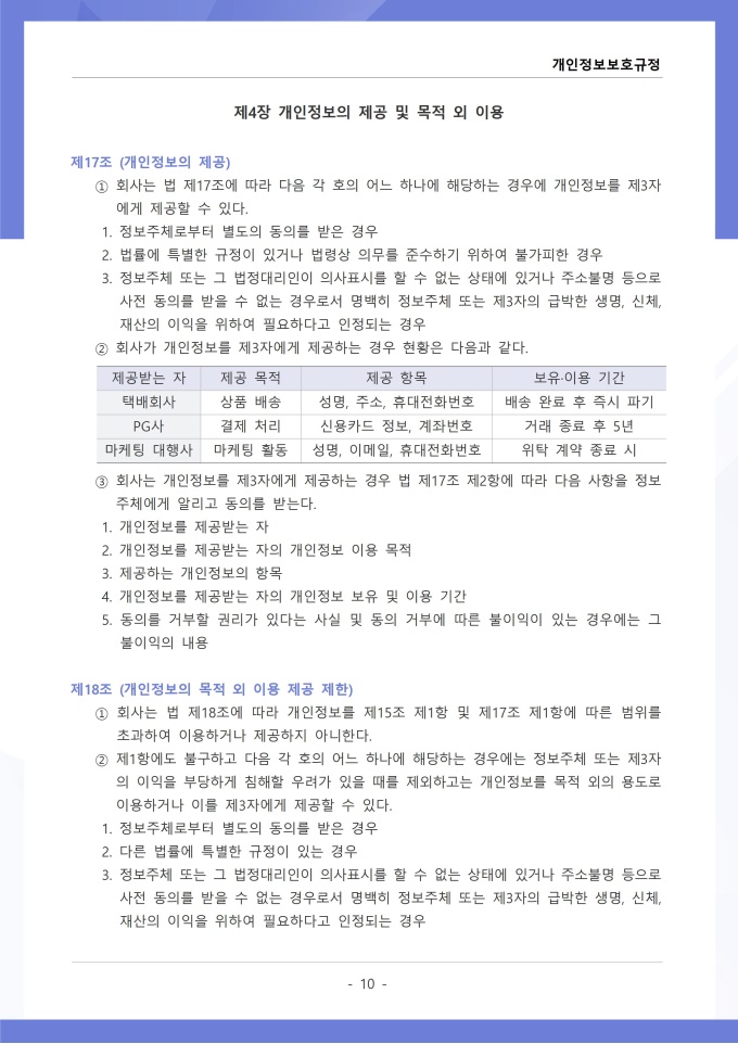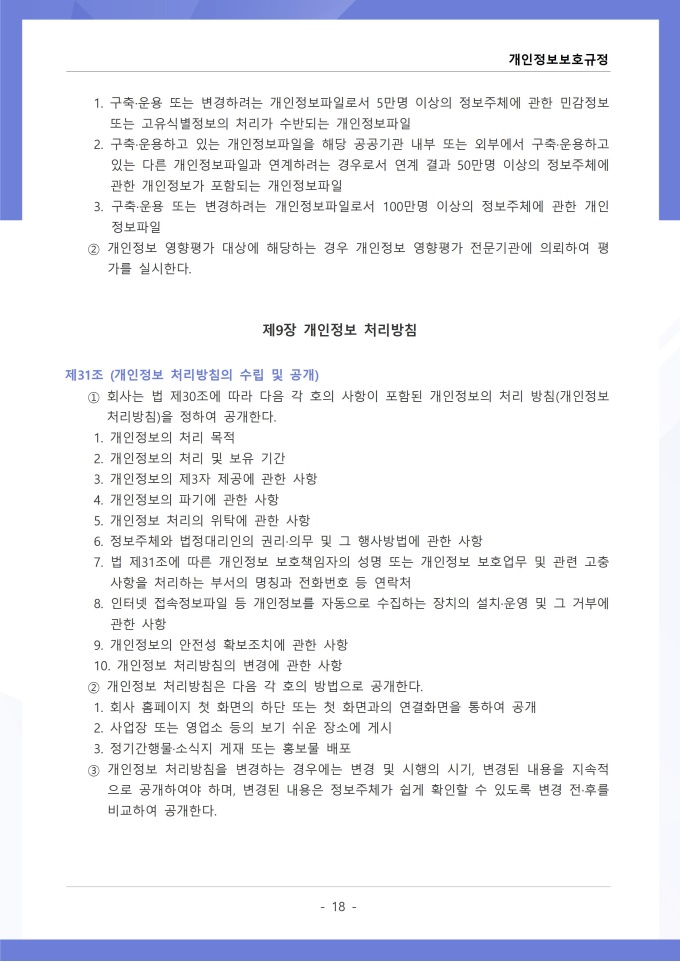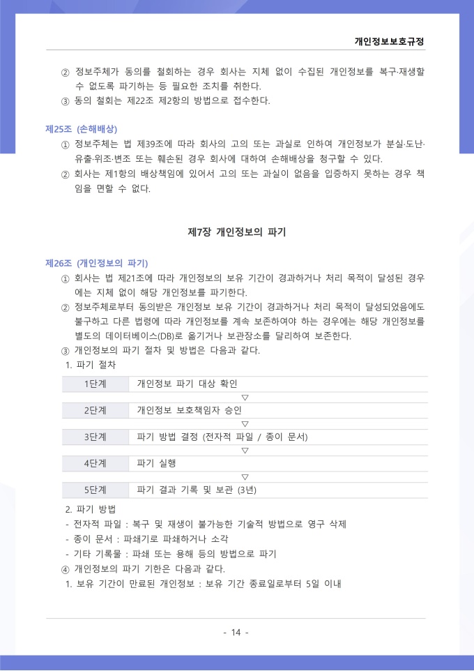 9,000원/월개인정보보호규정은 조직이 수집, 이용, 보관, 제공, 파기하는 개인정보의 처리 절차와 보호 대책에 관한 사항을 정하는 문서입니다. 이 규정에는 개인정보 수집 시 동의 절차와 수집 항목의 최소화 원칙, 목적 외 사용 금지 및 제3자 제공 시 고지 의무가 명시되어 있습니다. [회사 규정 패키지]는 취업규칙, 인사규정, 복무규정, 상벌규정, 경조사규정, 여비규정 등 조직 운영에 필수적인 각종 사규와 내규를 체계적으로 정립하는 데 필요한 다양한 서식들을 패키지로 제공합니다. 해당 패키지를 통해 회사는 투명하고 일관된 인사 및 조직 관리 기준을 마련할 수 있으며, 구성원들은 명확한 규정에 따라 권리를 보호받고 의무를 준수할 수 있습니다.