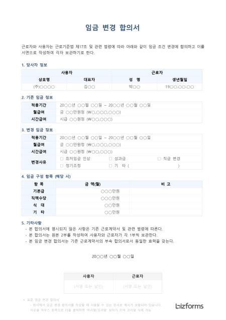 표준 임금 변경 합의서 서식입니다. 임금 변경 합의서는 근로자와 회사(사용자) 간에 기존의 임금 조건(연봉, 월급, 수당 등)을 변경하기로 합의하고, 그 내용을 문서화하는 서식입니다. 이는 승진, 직무 변경, 인사고과 결과 반영, 회사의 경영 상황 변화, 또는 법정 최저임금 인상 등의 다양한 사유로 임금이 변경될 때 사용됩니다.