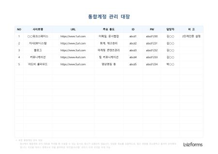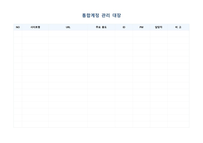 표준 통합계정 관리 대장 서식입니다. 통합계정 관리 대장은 조직 내에서 사용하는 모든 시스템, 서비스 등의 사용자 계정 정보를 중앙 집중적으로 관리하기 위한 문서입니다. 직원들이 업무를 수행하기 위해 접근해야 하는 다양한 IT 자원의 계정 정보를 체계적으로 기록하고 관리함으로써 보안 강화, 운영 효율성 증대, 그리고 컴플라이언스 준수를 목표로 합니다.