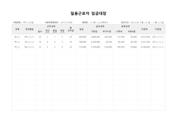 표준 일용근로자 임금대장 서식입니다. 일용근로자 임금대장은 일용직 근로자에게 지급된 임금 내역을 체계적으로 관리하기 위해 작성하는 문서입니다. 이 대장에는 근로자의 인적 사항, 근무내역, 근무 일수, 일급 정보와 총 지급액, 지급 일자 등이 명확히 기록되어야 합니다. 이를 통해 일용근로자 임금 지급 현황을 투명하게 관리하고, 근로 기준법과 세무 신고 등에 필요한 근거 자료로 활용할 수 있습니다.